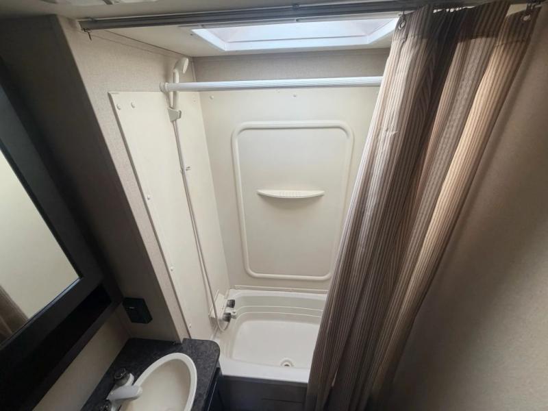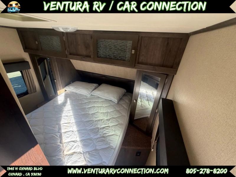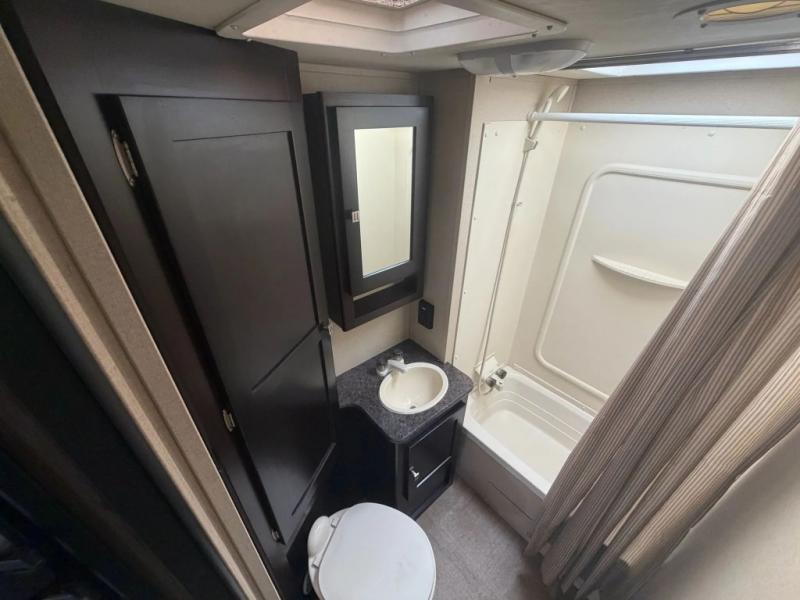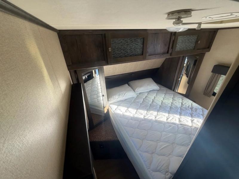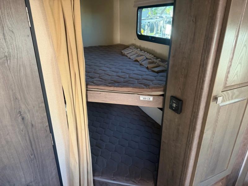 The front bedroom provides a queen bed, two wardrobes, overhead cabinets, and there is pass-through storage plus below the bedroom also.