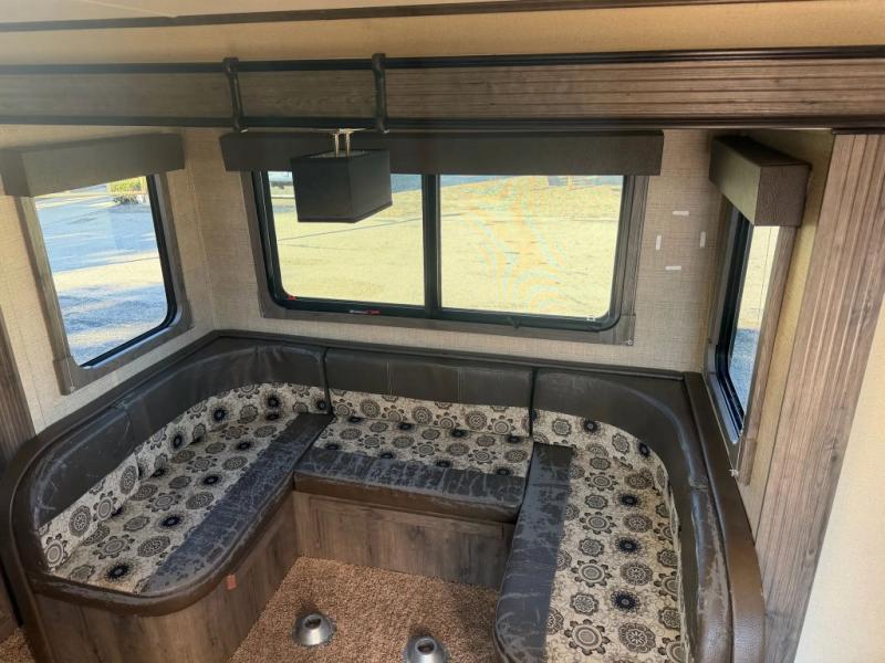 As you enter you will see the large 48" x 84" u-shaped dinette slide. You will have plenty of space for everyone to enjoy a meal, a board game or two, or just to sit and hang out. There is an entertainment center just off the foot of the bedroom in front that can easily be viewed from the dinette seating also.