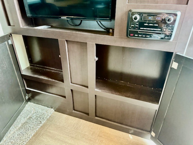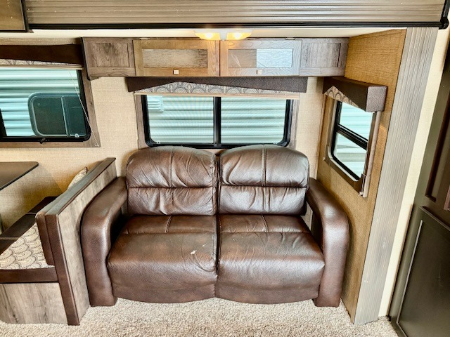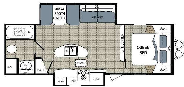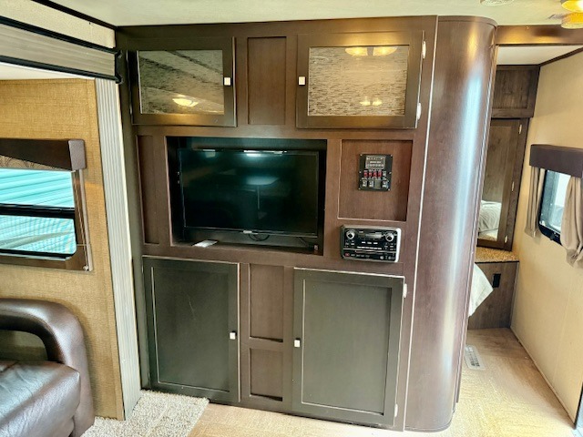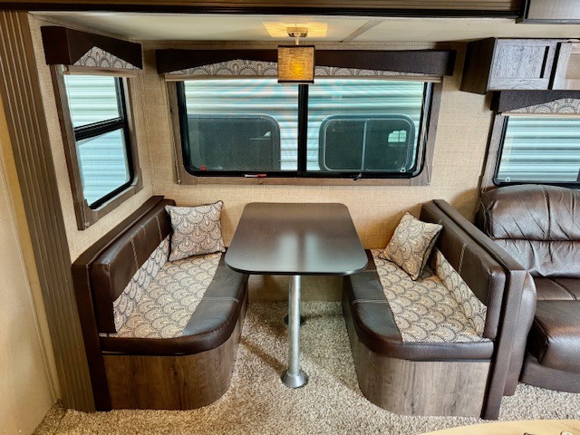 Across the room you will find a booth dinette and 64" sofa. The sofa has overhead storage for your things. There is an entertainment center nearby that can easily be viewed for your enjoyment.