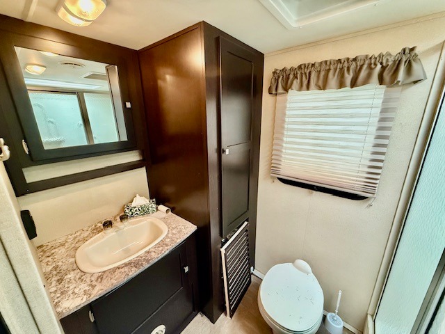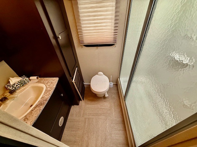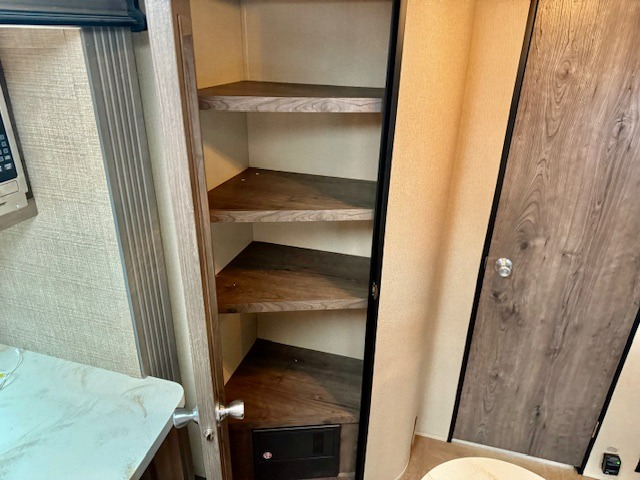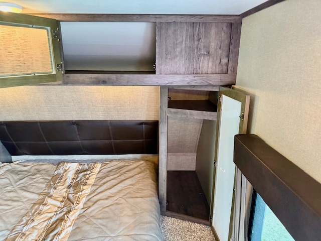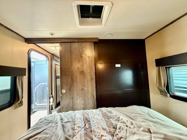 The front bedroom provides a private retreat with queen bed and plenty of storage with two wardrobes and overhead cabinets. There is even a pass-through storage compartment below the bedroom for outdoor camping gear and more.