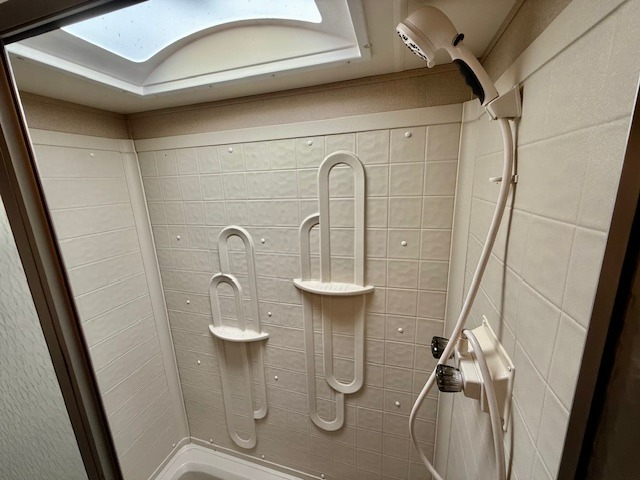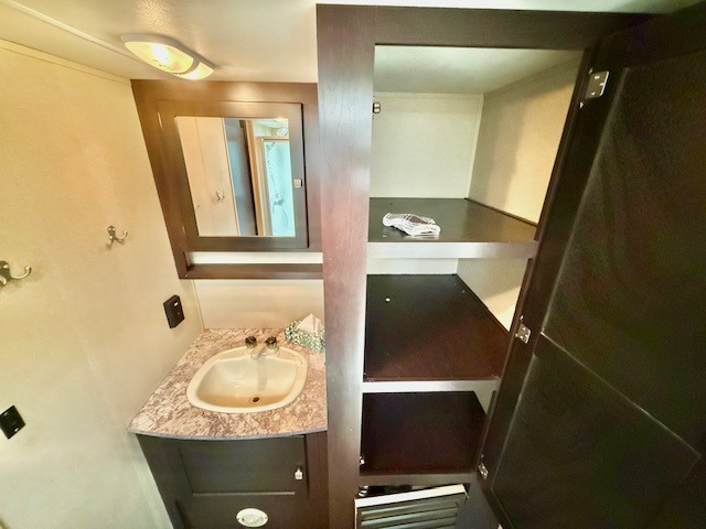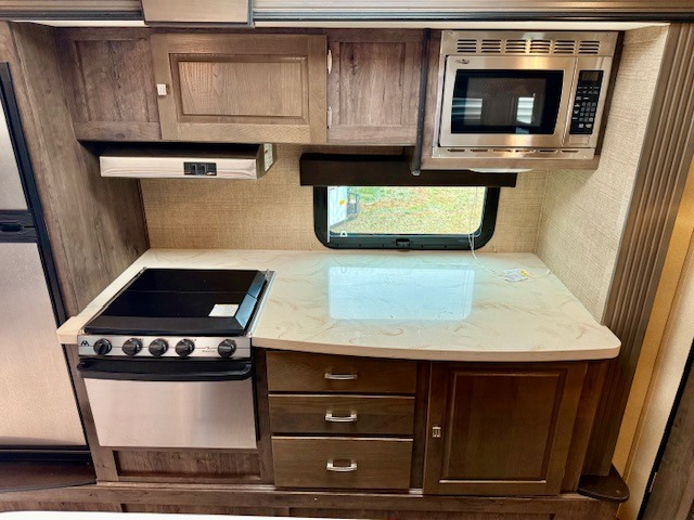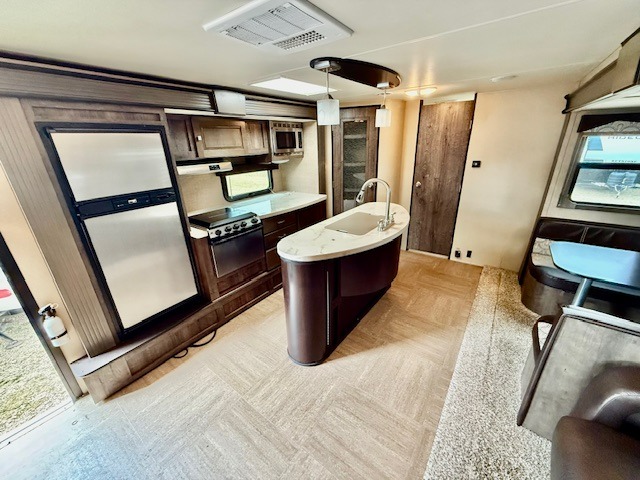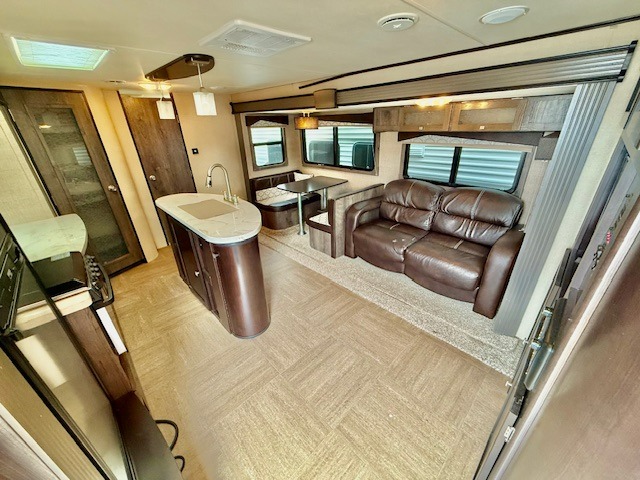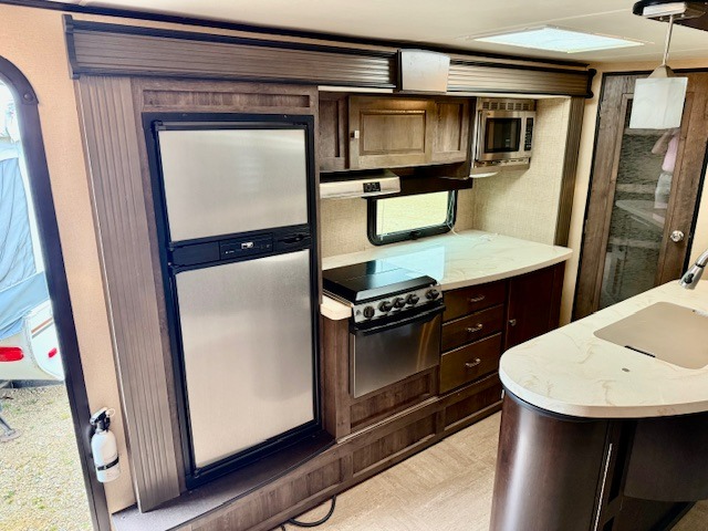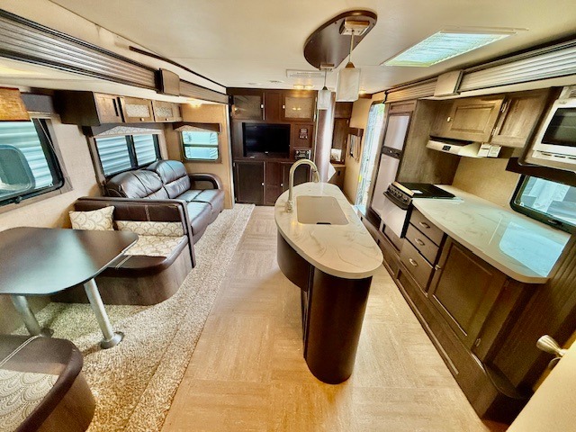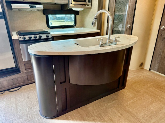 As you enter you will be amazed at the space inside with dual opposing slides fully extended. The kitchen features everything you need to prepare and cook great food while on the go. There is a refrigerator, three burner range, and counter area with overhead microwave slide out. Near the slide find a large pantry for dry and canned goods storage and more. The convenient island features a bit more counter space and a double sink for cleanup. There is even a skylight to bring the natural light indoors.
