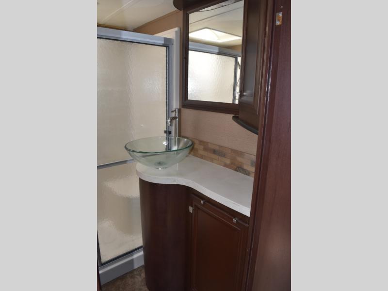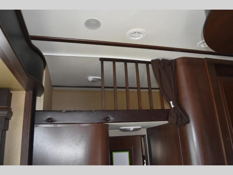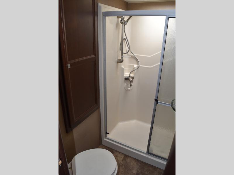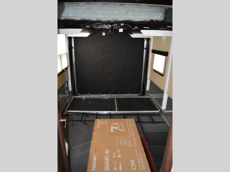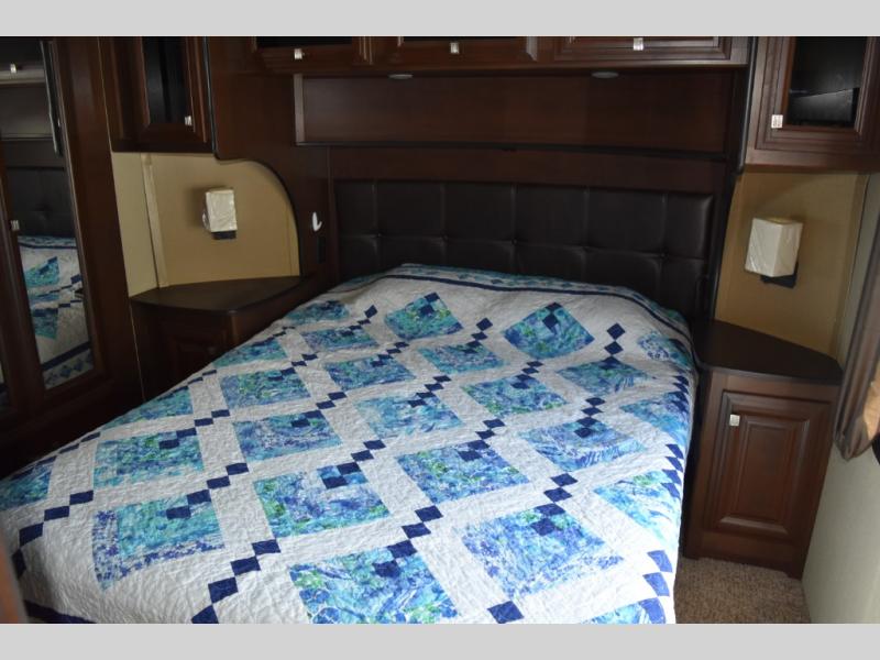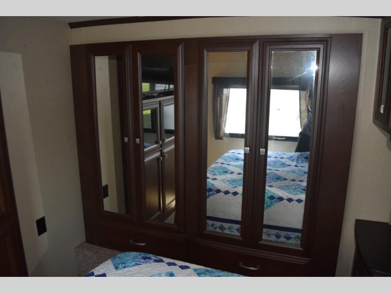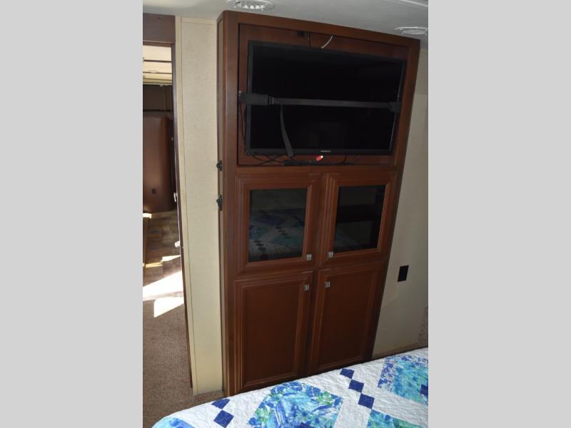 The door at the head of the hall leads into the front master bedroom where you will easily be able to rest up for another full day of adventure. There is a comfortable queen size bed with storage, dual nightstands and overhead cabinets, and a slide out double wardrobe, plus 32" TV.
