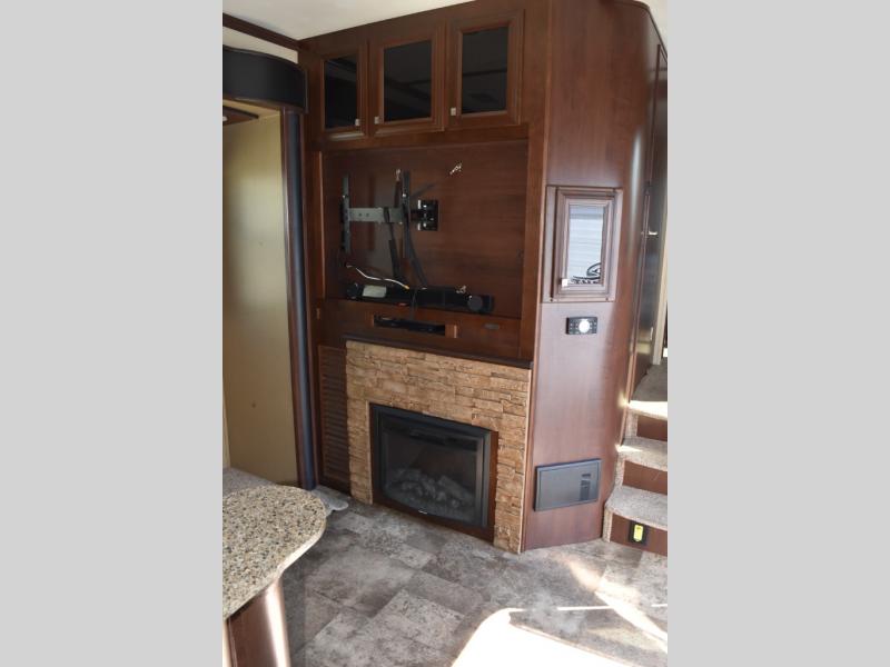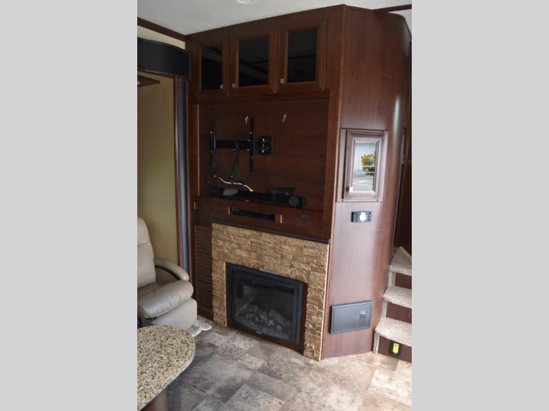 There is a nearby entertainment center, TV, and fireplace just adjacent to the recliner slide out for viewing pleasure.