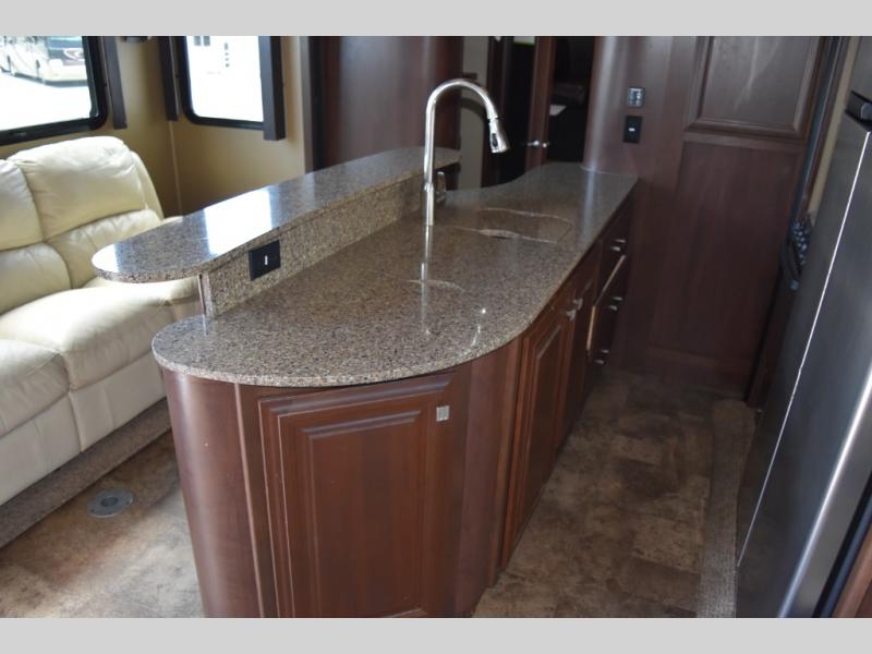 Further inside notice a slide out reclining sofa on the door side along with a stowable table for dining or games. A large counter peninsula is on your left with a double kitchen sink making cleaning up a breeze. Opposite the sofa slide find a second large slide out featuring a double sofa, refrigerator, and three burner range with overhead microwave.