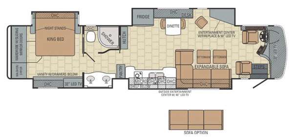 Along the passenger side of the motor home you will find a slide with an expandable sofa or an optional sofa, double kitchen sink, two burner range, and microwave. Next to the slide you will find a pantry. On the opposite side of the motor home there is a slide with an entertainment center, fireplace and 50" LED TV, dinette, and refrigerator. Next to the slide you will find a nice size hutch.