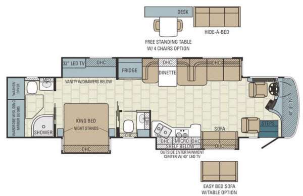 As you enter the motor home, along the passenger side there is a slide with a sofa, two burner range, microwave, and double kitchen sink. Just past the slide you will find a half bath. The opposite side of the motor home offers a full wall slide with a sofa, dinette, refrigerator, vanity with drawers, and a 32" LED TV. You can even choose an optional free-standing table with chairs and a hide-a-bed in place of the dinette ensemble.