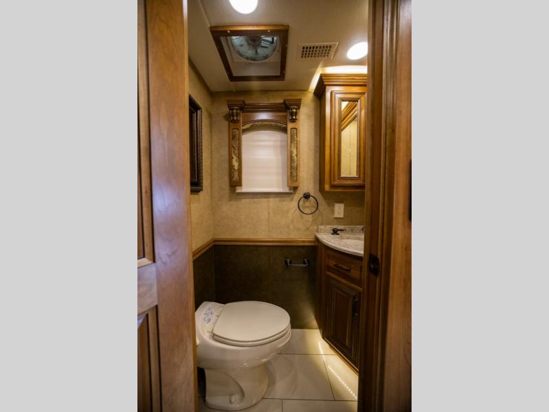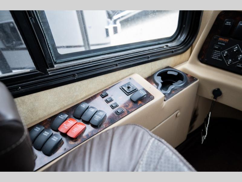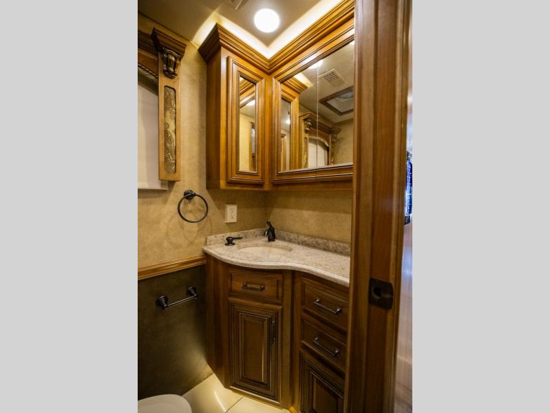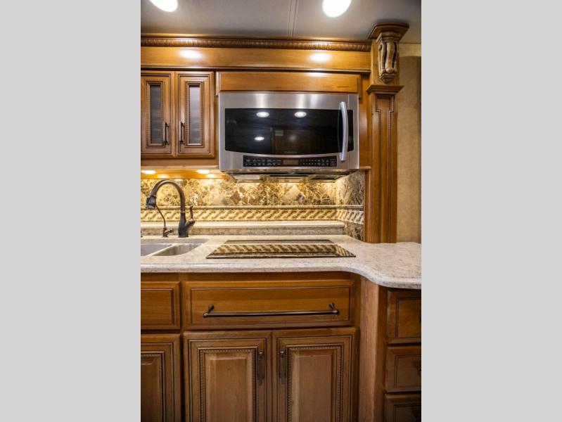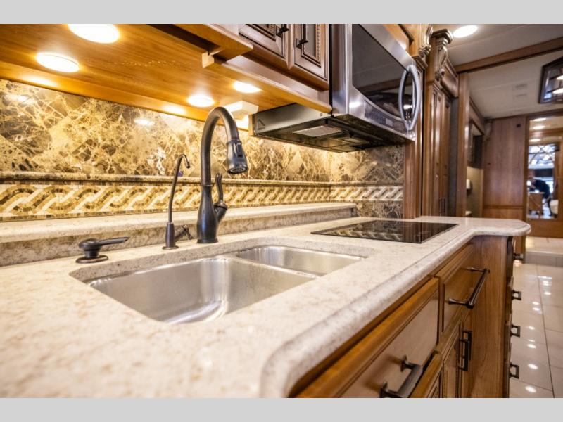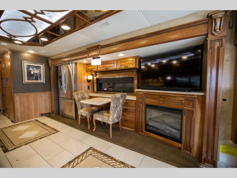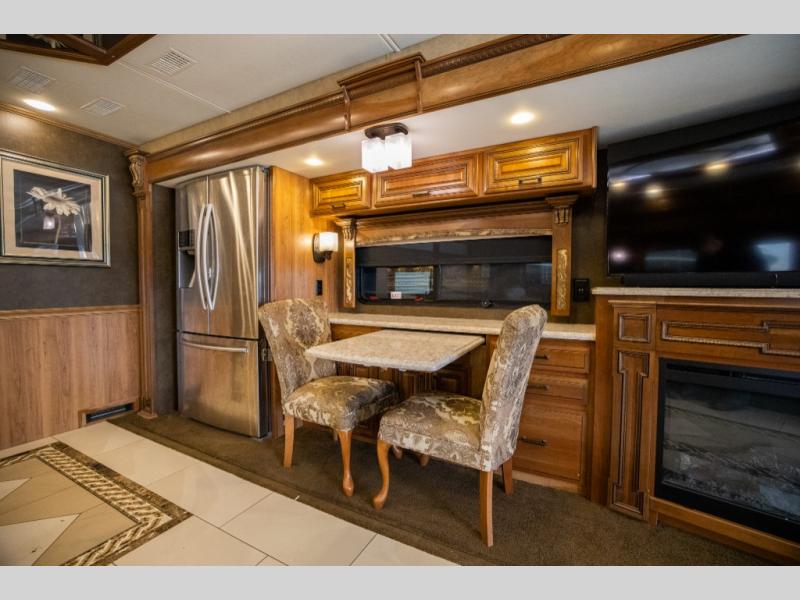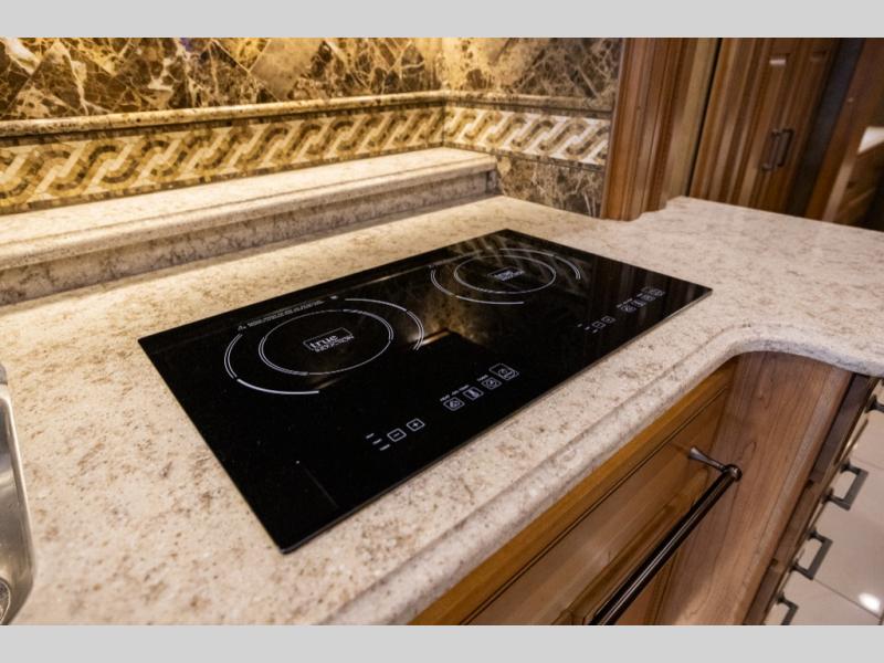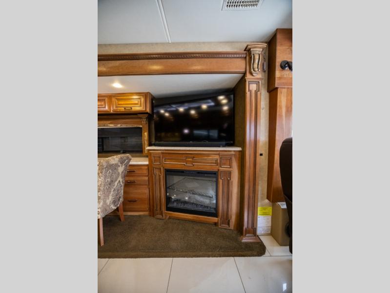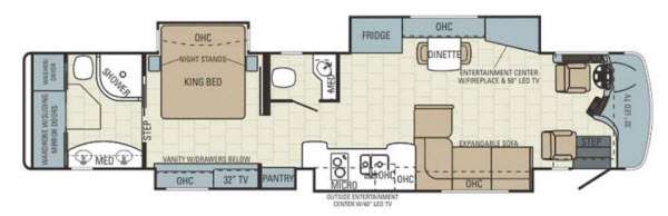 On the passenger side of the motor home you will find a slide with an expandable sofa or you can choose an optional hide-a-bed sofa, double kitchen sink, two burner range, and microwave. The opposite side of the motor home offers a slide with an entertainment center with fireplace and a 50" LED TV, dinette, and refrigerator.