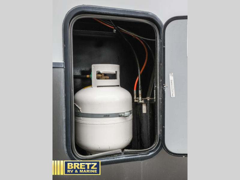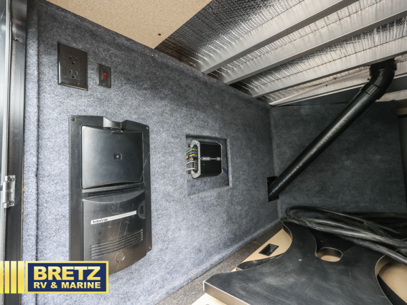 In the rear, there is a large cargo area. There is a sleeper sofa with a queen bed above. The bath and a half is in the corner of the cargo area. Along one side of the garage there is an optional 40" TV and 12' of garage storage space. You can even enjoy the outdoors without being on the ground thanks to the optional patio.