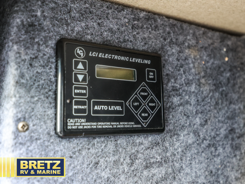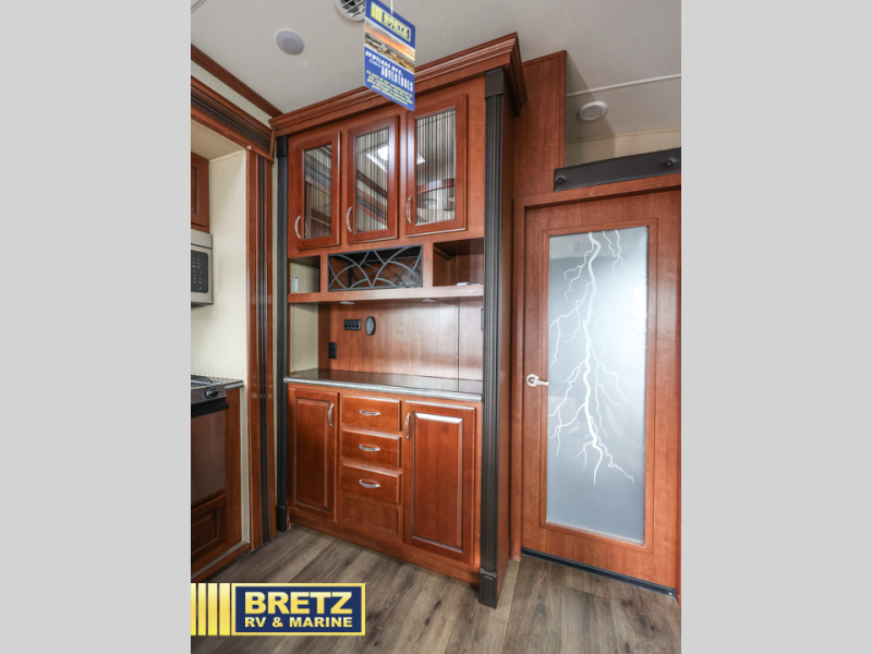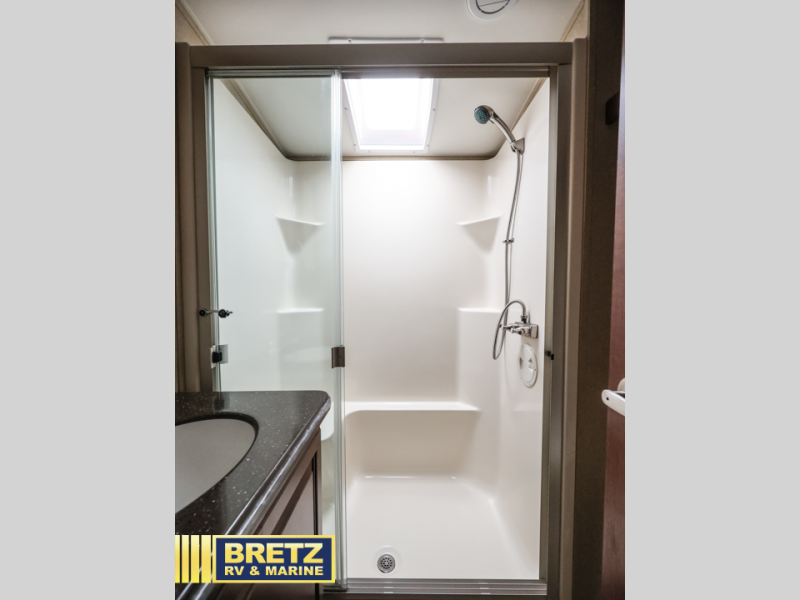 The bedroom has a queen bed slide or you can choose an optional king bed, and large wardrobe. Be sure to notice that the wardrobe has been washer/dryer prepped for your convenience. Across from the bed there is a large dresser, curved overhead cabinets, and an optional TV. Along the front of the room there is a large wardrobe, and so much more!