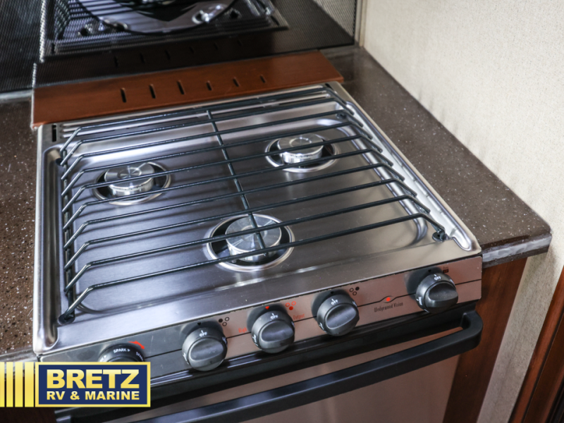 In the main living area you will find a slide with a refrigerator, pantry, and range. The opposite side of the fifth wheel has a recliner sofa. In the middle of the kitchen there is a kitchen island with a sink and a dishwasher.