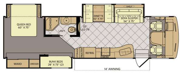 The living and kitchen areas offer a 32" LED tv, and a dinette and sofa sleeper slide. The opposite side of the motor home has a double kitchen sink, three burner range, microwave, refrigerator, pantry, and storage.