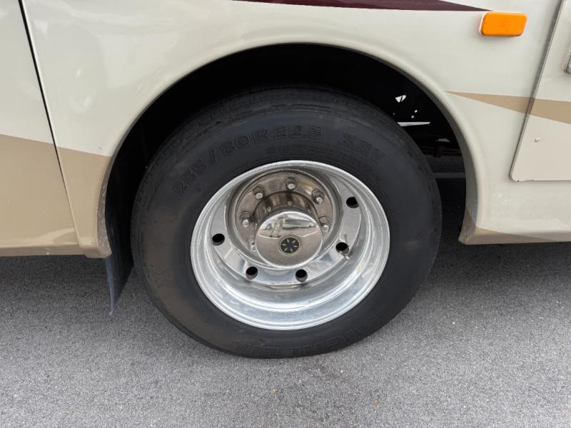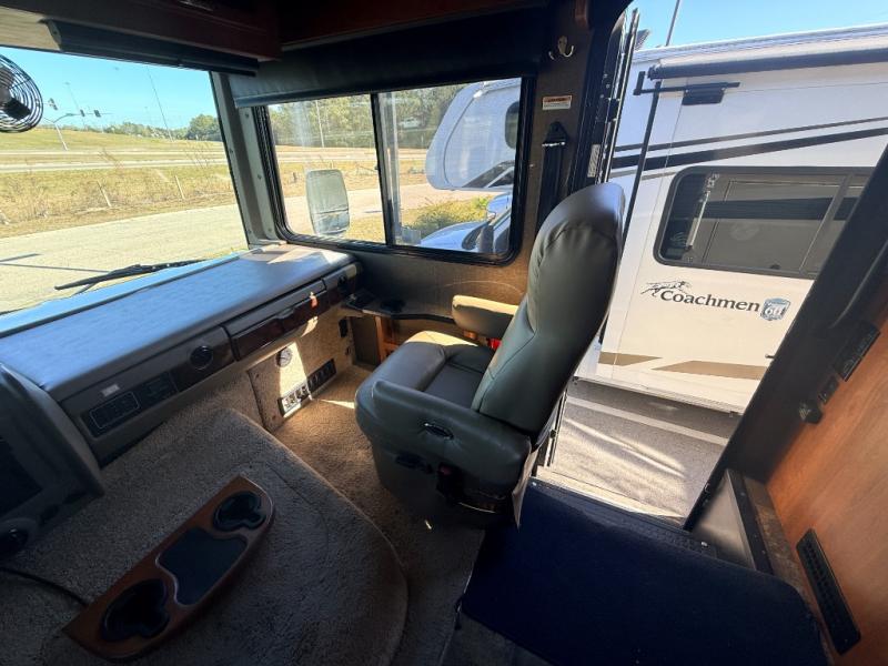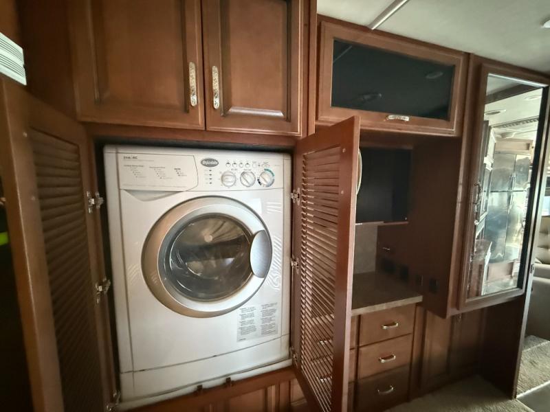 There is plenty of storage with all of the overhead cabinets in this motor home. You also have many options available to you such as, a front 32" LCD TV, exterior entertainment center, three burner range with oven, washer and dryer, fireplace, facing dinette, free-standing dinette with credenza.