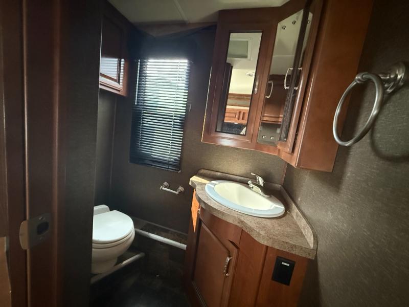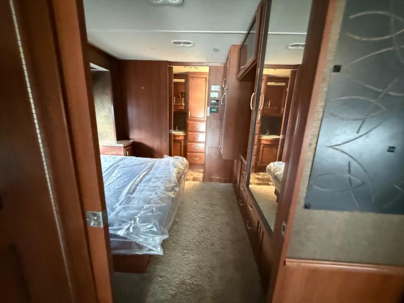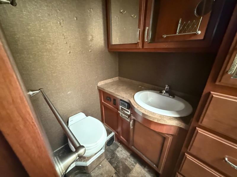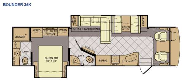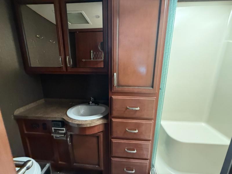 The Bounder 35K Fleetwood motor home features a rear master bathroom as well as convenient half bath. In the rear of the motor home, you will find a toilet, medicine cabinet, sink, linen cabinet, and shower. The bedroom offers a queen size bed and nightstands slide, double wardrobes, a dresser, and a 32" LED TV. As you leave the bedroom, a half bath is located to the right.