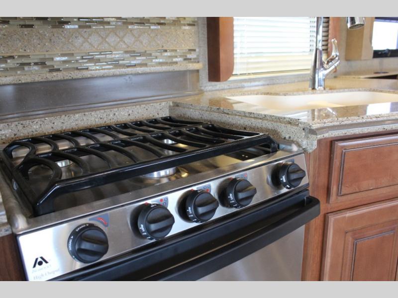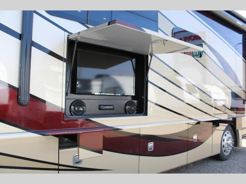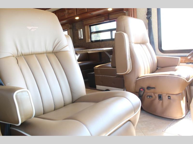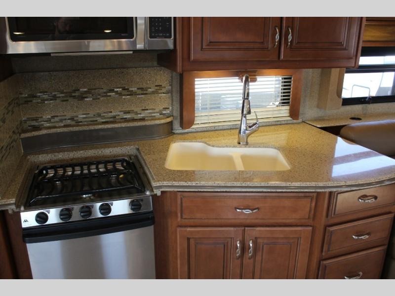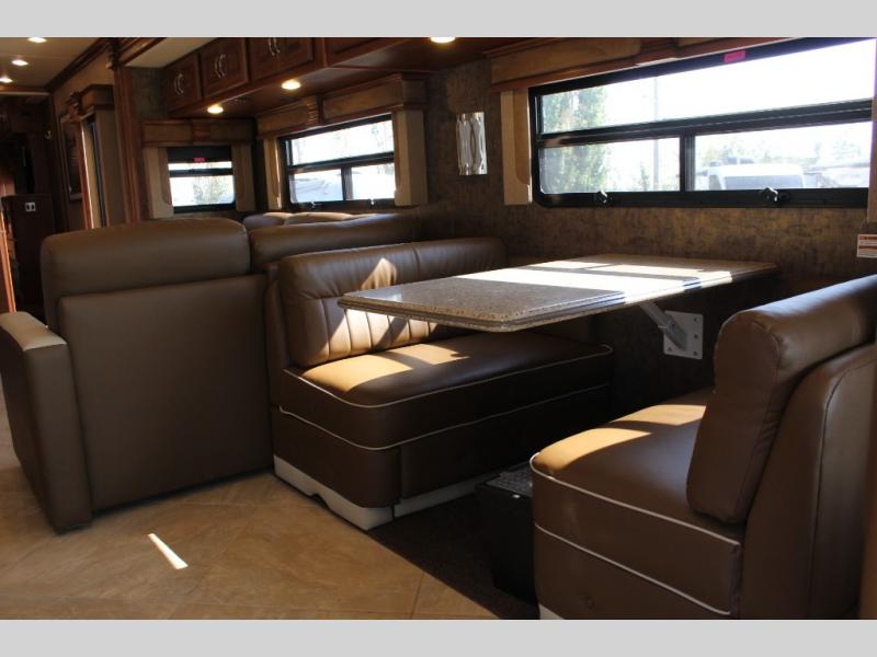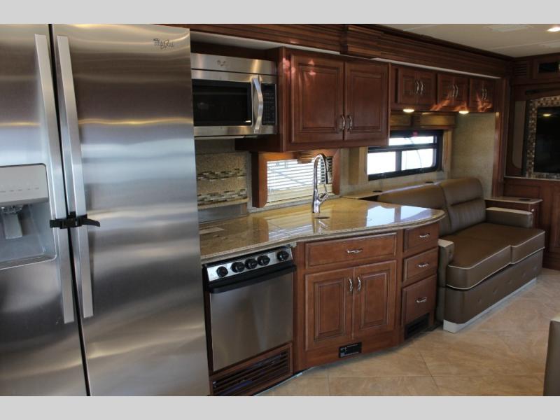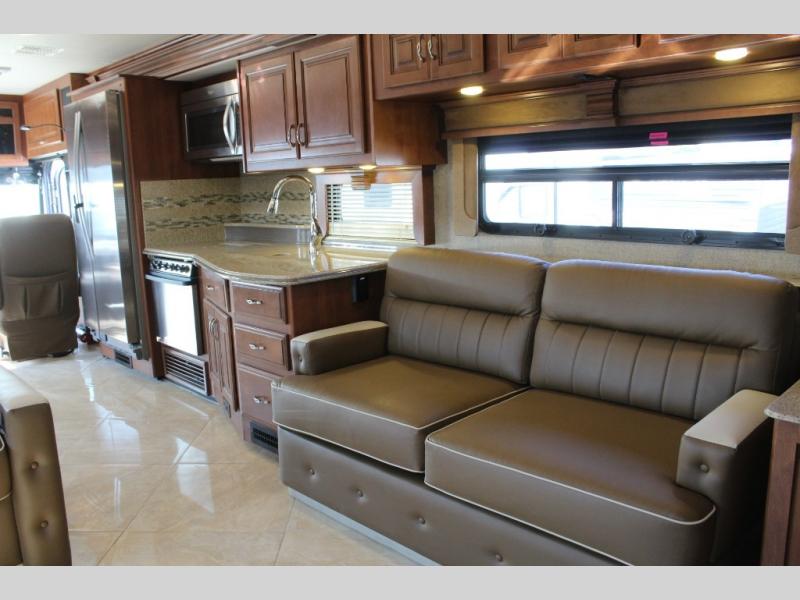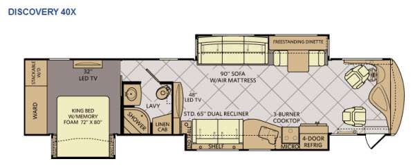 Stepping inside the Discovery 40X motor home by Fleetwood, you will be impressed with how spacious it feels. As you enter on the left is a refrigerator, three burner range, microwave, double kitchen sink, dual recliners, and end table slide. The opposite side of the motor home has a free-standing dinette and sofa slide. You can enjoy watching TV on the 48" LED TV.