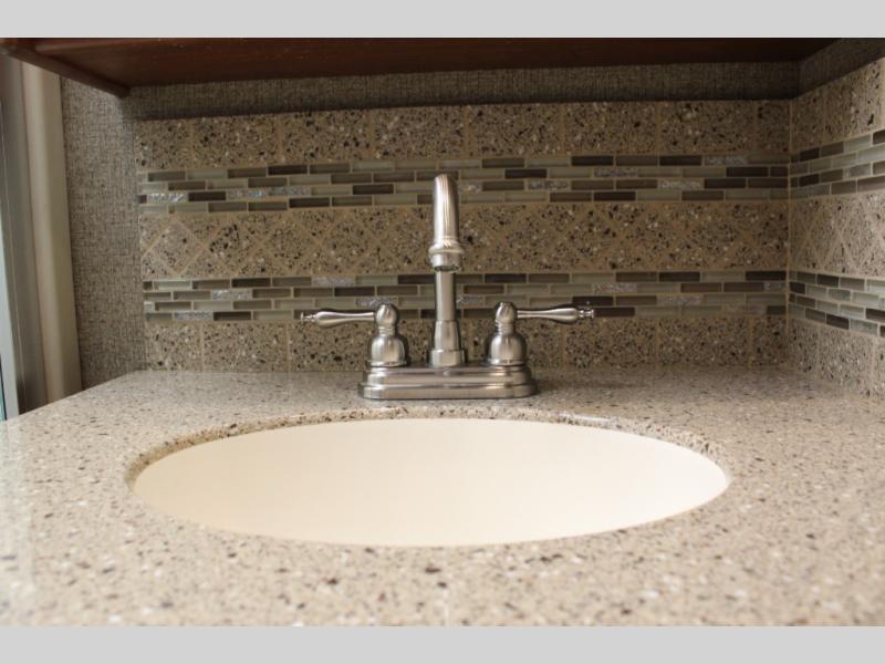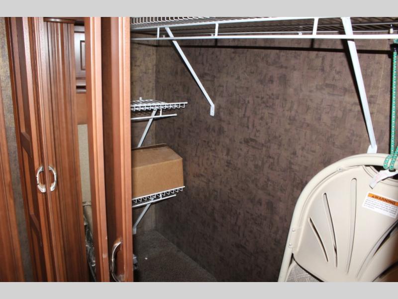The bedroom is in the rear of the motor home, and has a king bed with memory foam mattress slide. There is plenty of space with the wardrobe and stackable washer and dryer. You can enjoy watching tv on the 32" LED TV in the bedroom.
