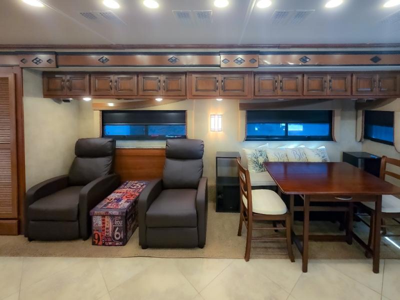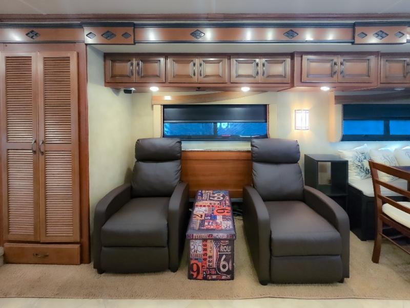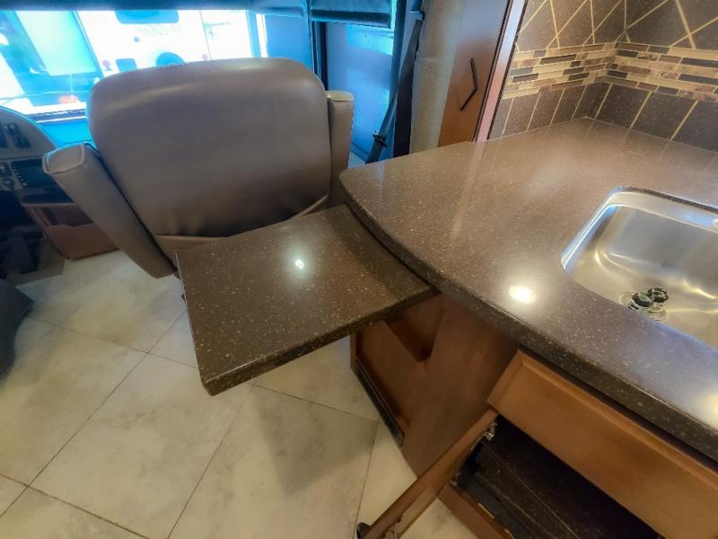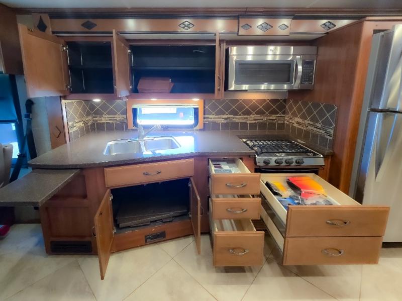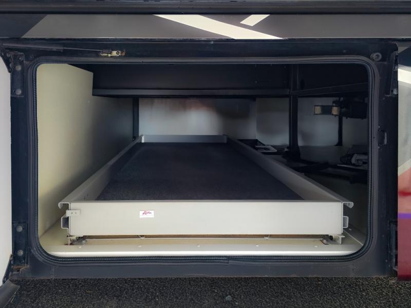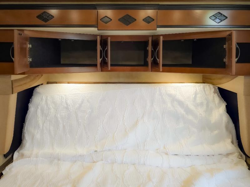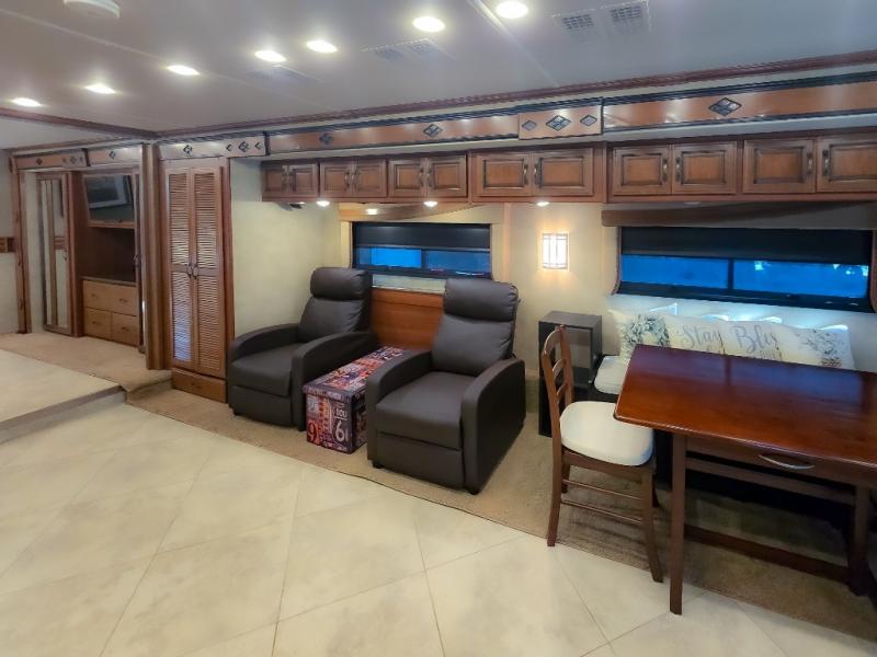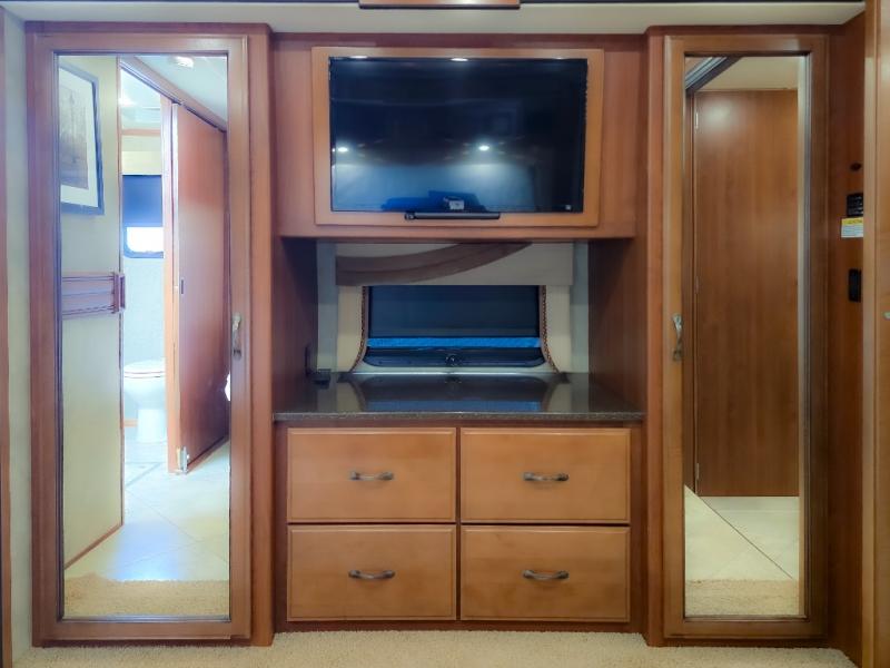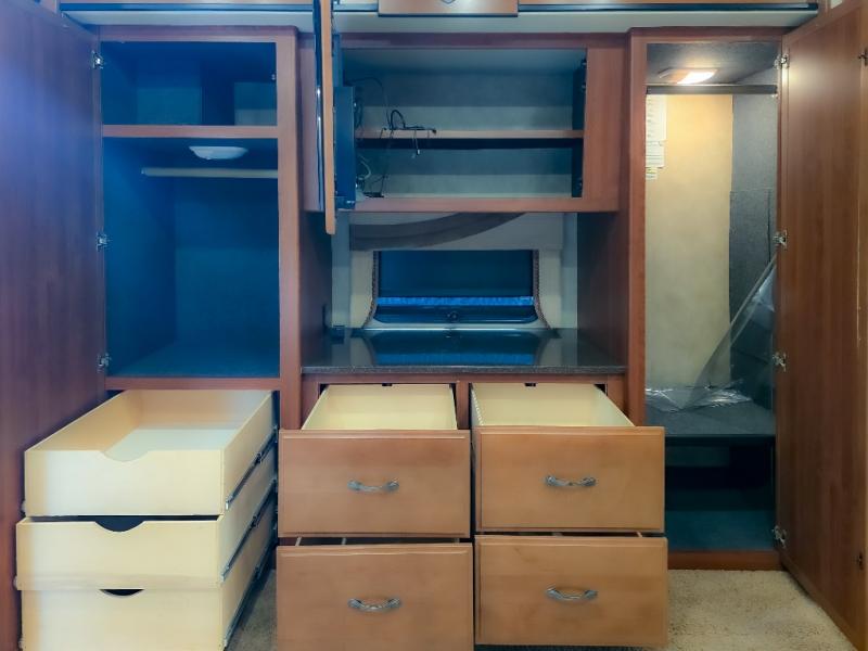 As you enter the motor home, on the passenger side you will find a slide with a double kitchen sink, three burner range, microwave, refrigerator, and pantry. Next to the pantry there is a 40" LED TV for your enjoyment. The opposite side of the motor home offers a full wall slide with a free-standing dinette or an optional u-dinette, l-transformer sofa, storage cabinet, and wardrobes. There is even a 32" LED TV above the wardrobe.