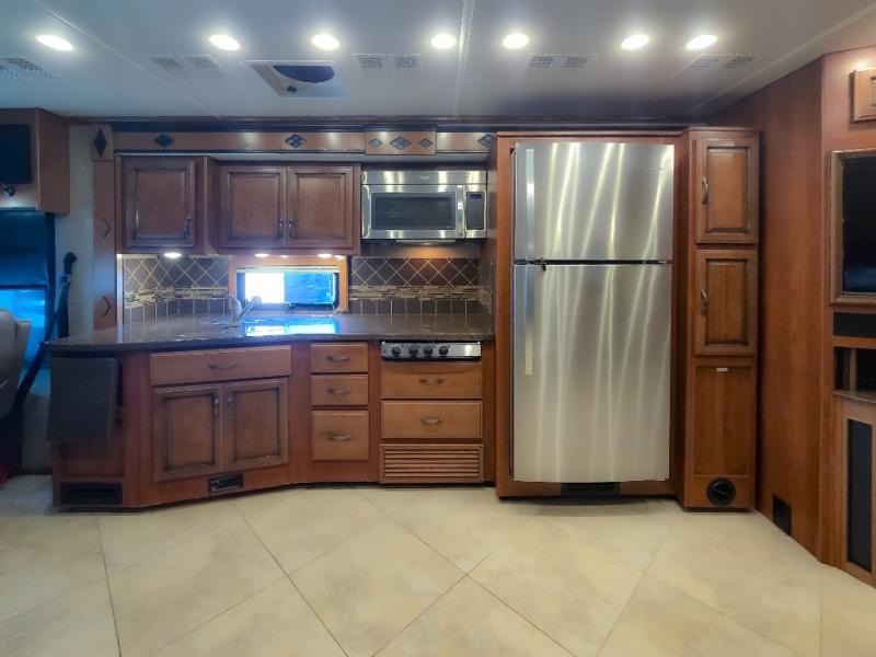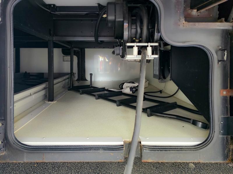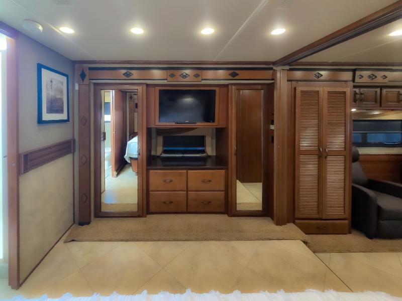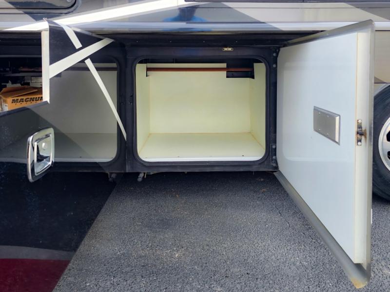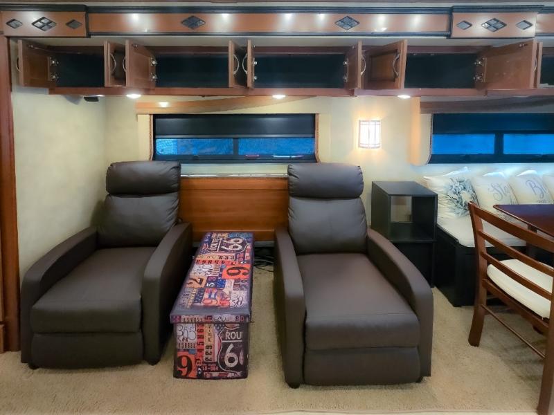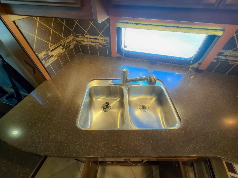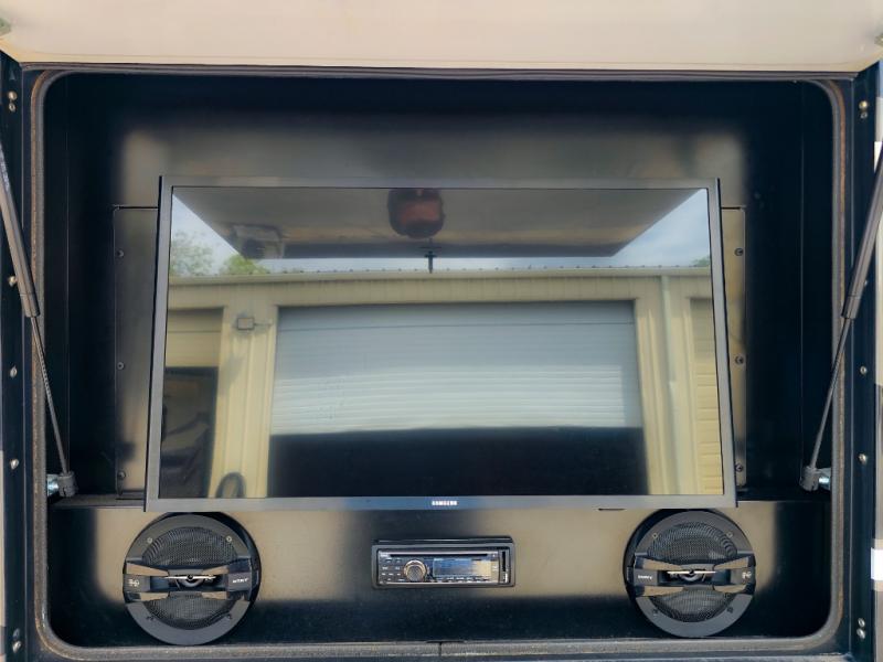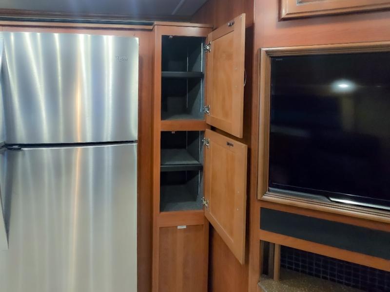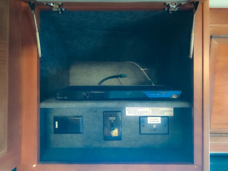 As you enter the motor home, on the passenger side you will find a slide with a double kitchen sink, three burner range, microwave, refrigerator, and pantry. Next to the pantry there is a 40" LED TV for your enjoyment. The opposite side of the motor home offers a full wall slide with a free-standing dinette or an optional u-dinette, l-transformer sofa, storage cabinet, and wardrobes. There is even a 32" LED TV above the wardrobe.