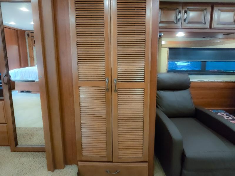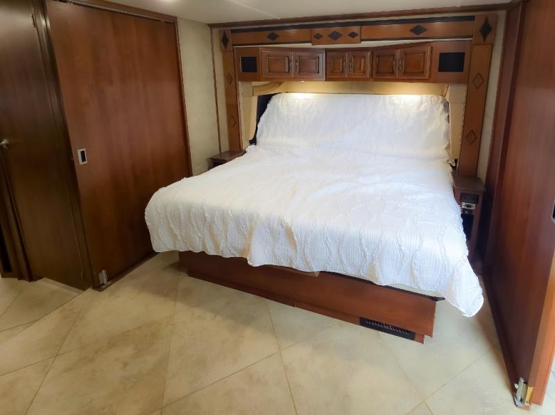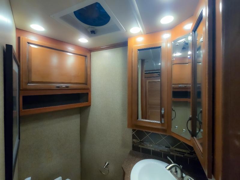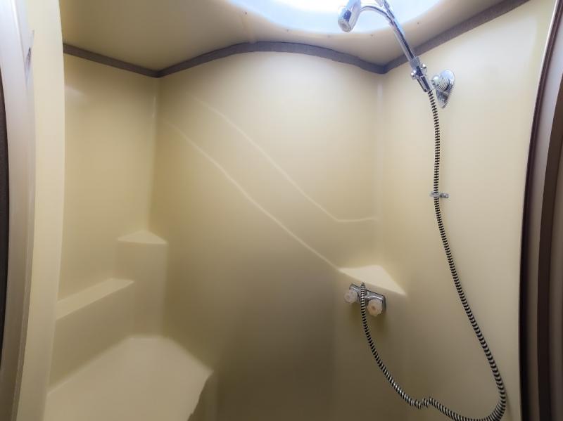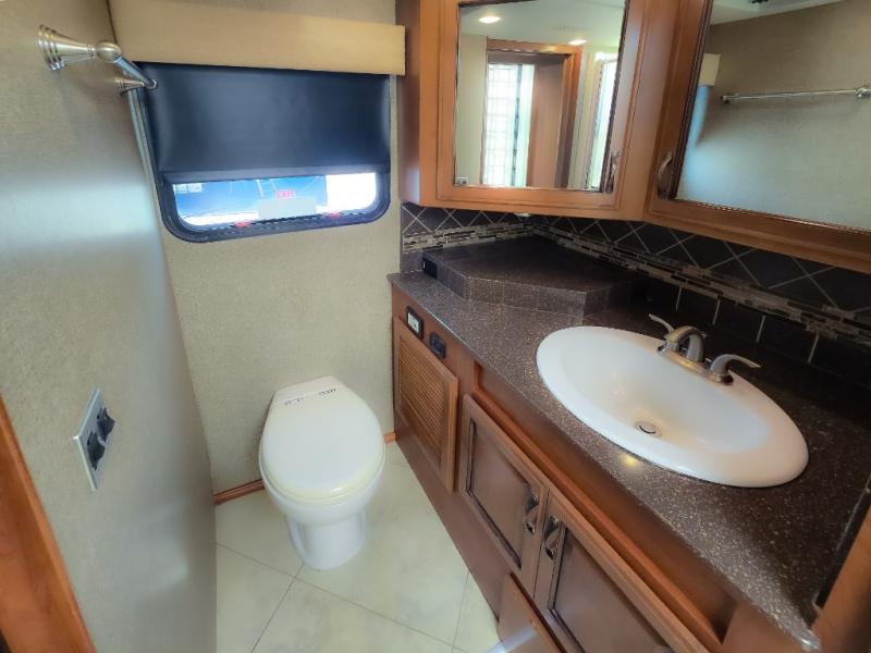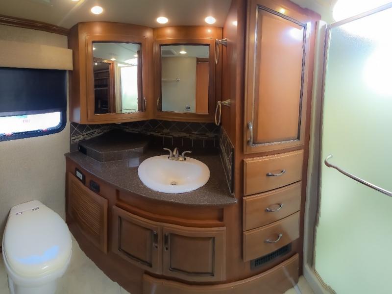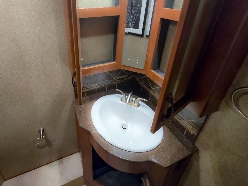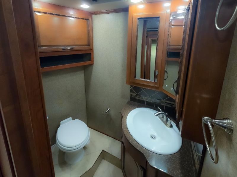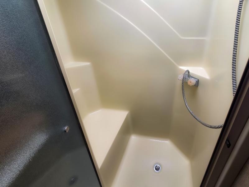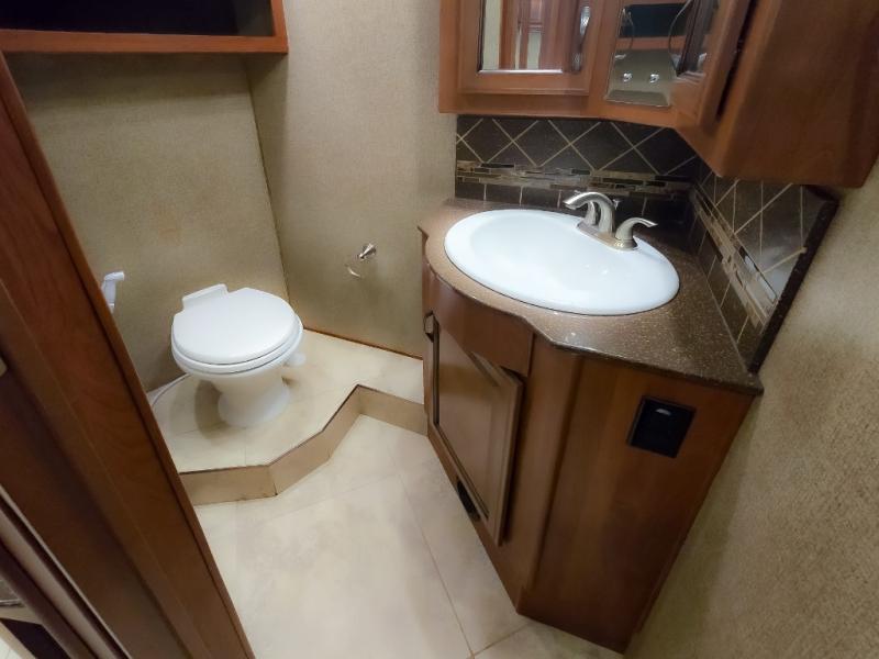 In the bedroom across from the wardrobes you will find a king bed with memory foam slide, or you can choose an optional king bed with air mattress. In the very rear of the motor home there is a nice size bathroom with a toilet, sink, linen cabinet, and shower with seat. As you leave the bedroom and proceed toward the front of the motor home you will find a convenient half bath.