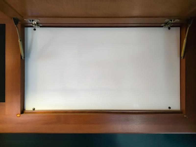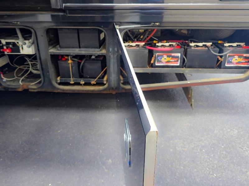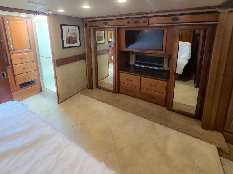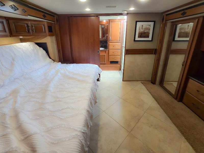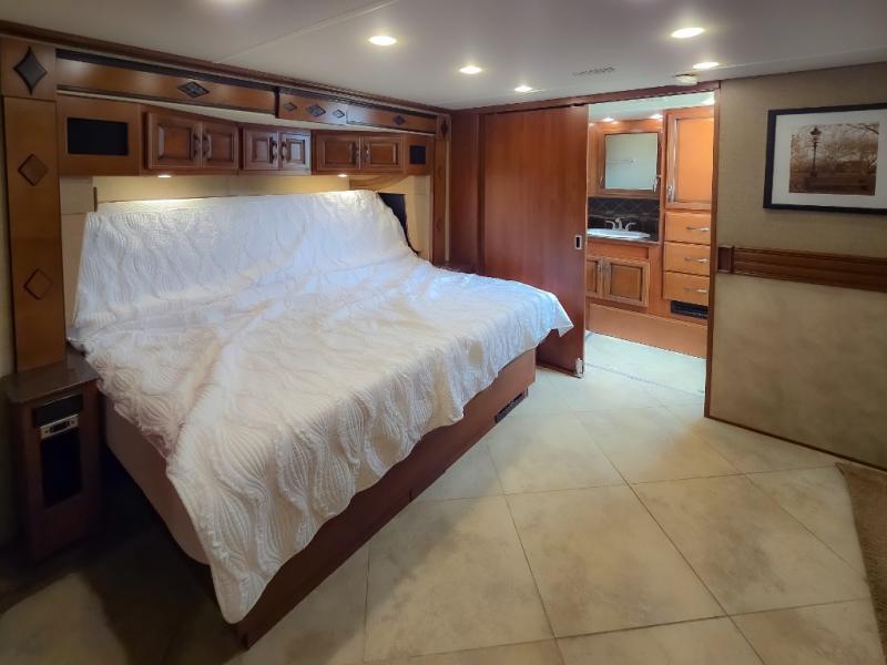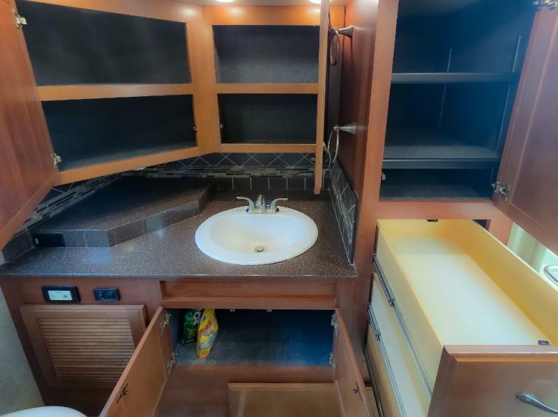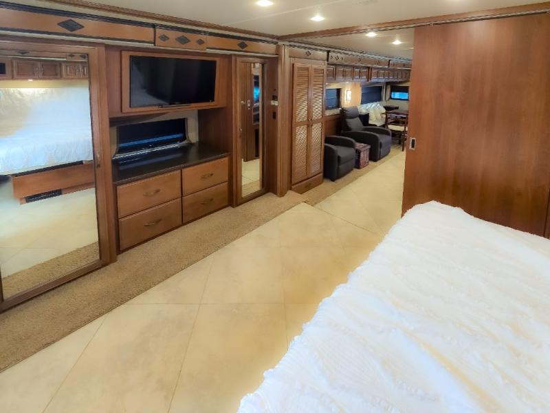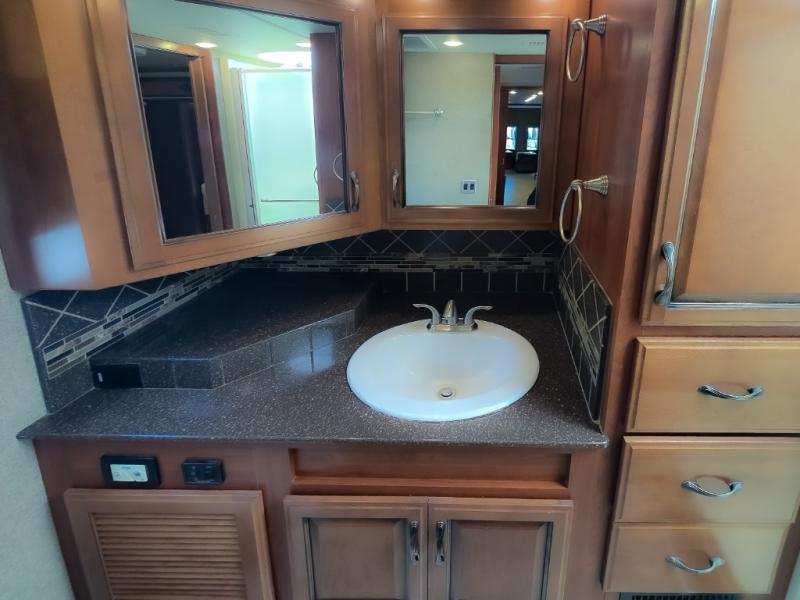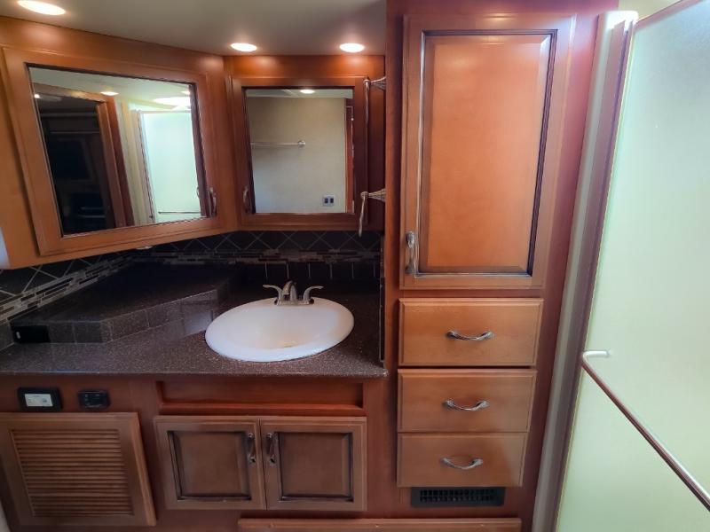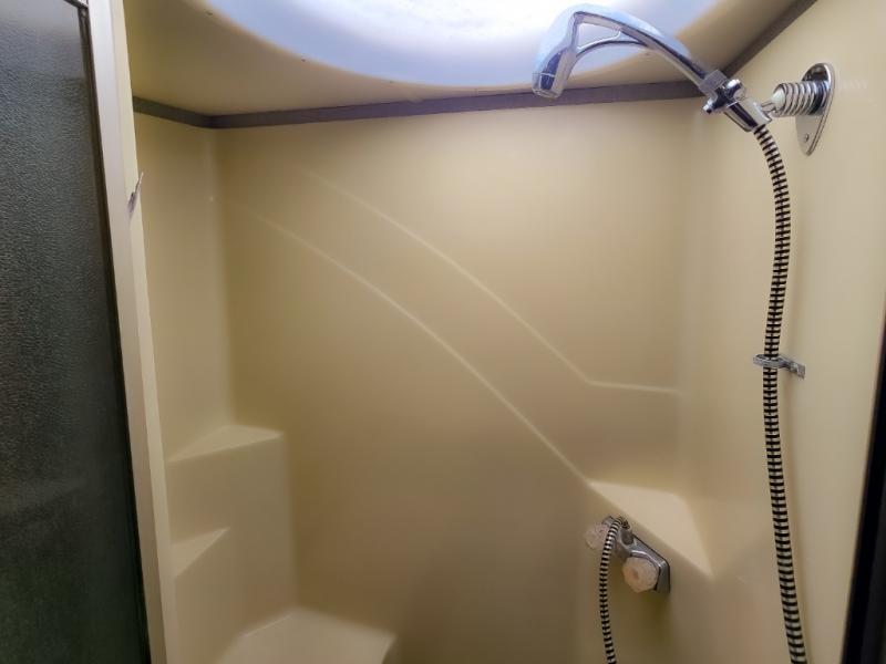 In the bedroom across from the wardrobes you will find a king bed with memory foam slide, or you can choose an optional king bed with air mattress. In the very rear of the motor home there is a nice size bathroom with a toilet, sink, linen cabinet, and shower with seat. As you leave the bedroom and proceed toward the front of the motor home you will find a convenient half bath.