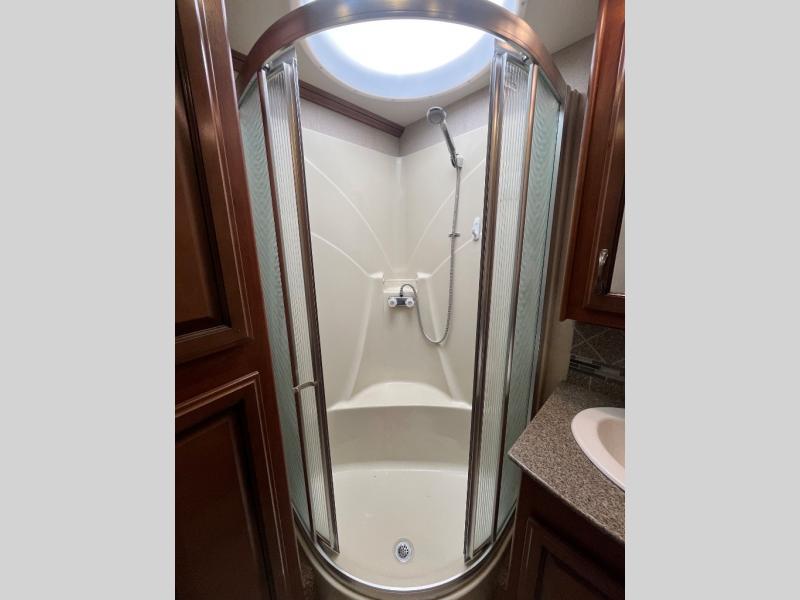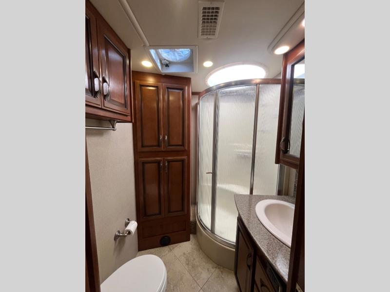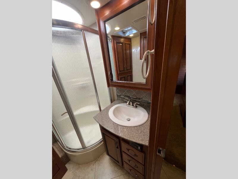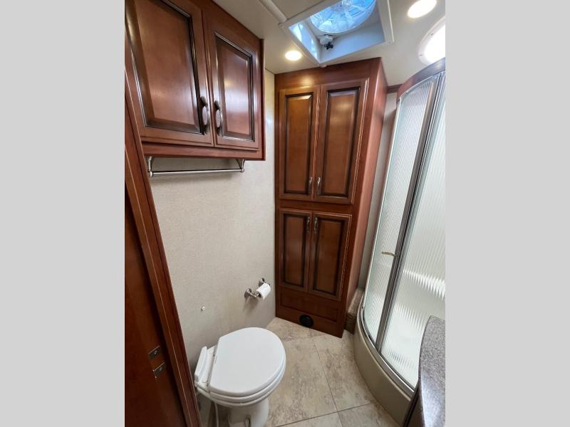 Proceeding toward the rear of the motor home, you will come to a bathroom. Inside you will find a sink, linen cabinet, corner angle shower, and toilet.