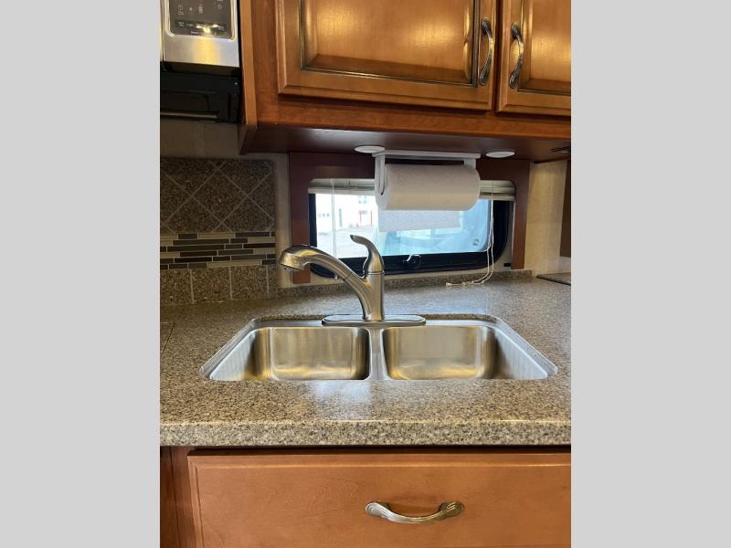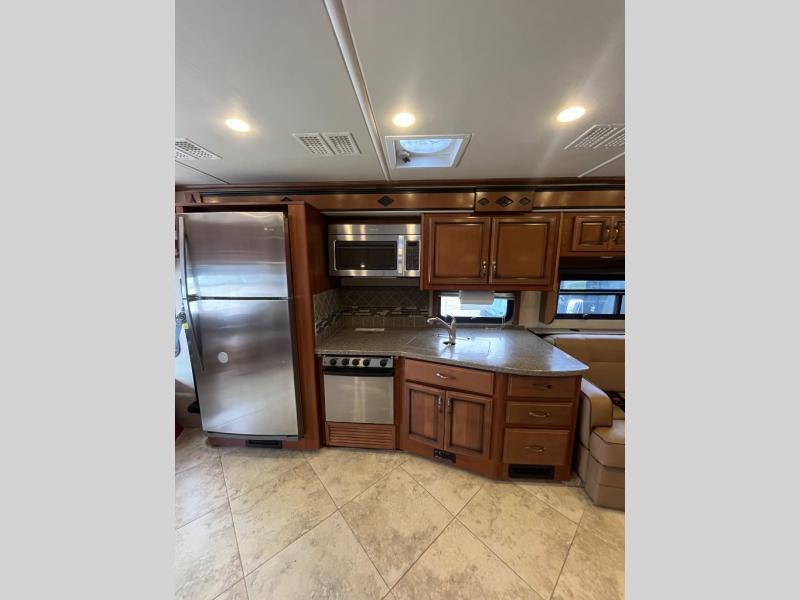 Stepping inside the 40X Expedition motor home by Fleetwood, you will be impressed with all of the space that is available. To the left of the entrance is a slide with a refrigerator, three burner range, microwave, double kitchen sink, dual recliners, and end table. The opposite side of the motor home has another slide with free-standing dinette and sofa. You can enjoy watching TV on the 48" LED TV.