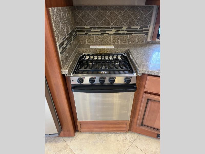 You can choose a few options, such as a front 32" LCD TV, exterior entertainment center, three burner cooktop, stackable washer and dryer, residential refrigerator, expandable l-sofa, u-shaped dinette/sofa, facing dinette, and king bed with air mattress.