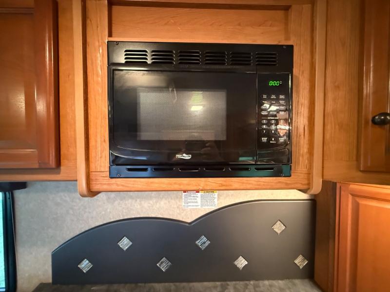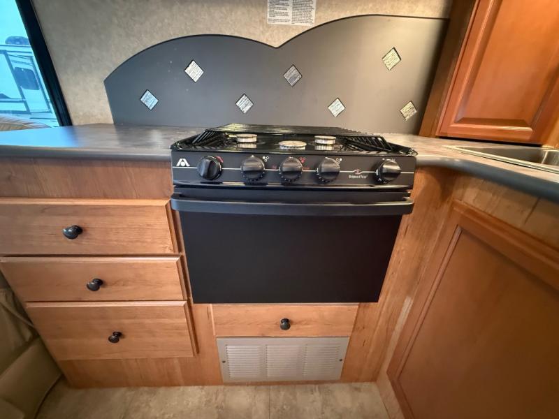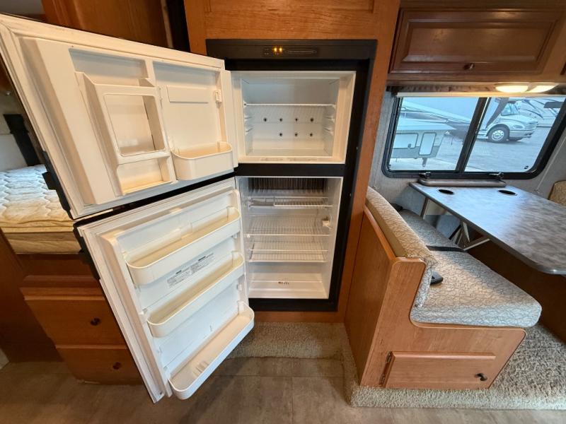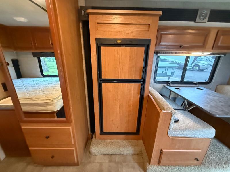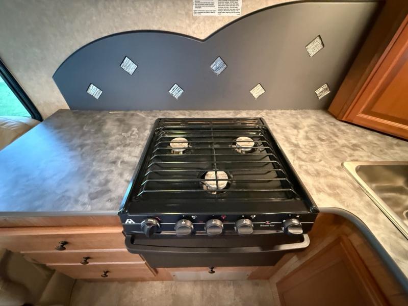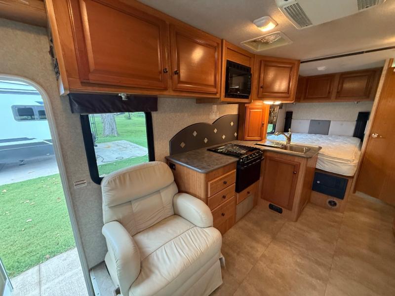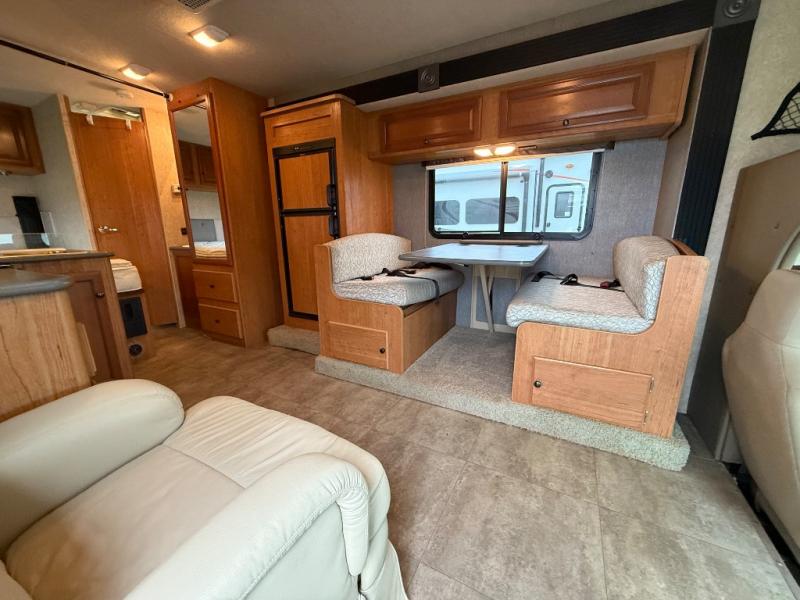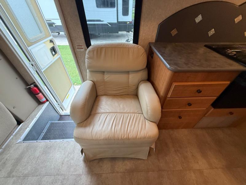 Stepping inside the 25K Jamboree Searcher motor home by Fleetwood, you will immediately notice that there is more space due to the slide. As you enter there is a free-standing recliner to the left. The kitchen area has a three burner range, microwave, and sink. The slide features a dinette and refrigerator.