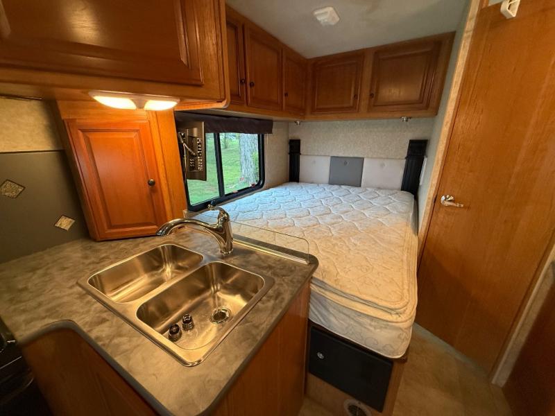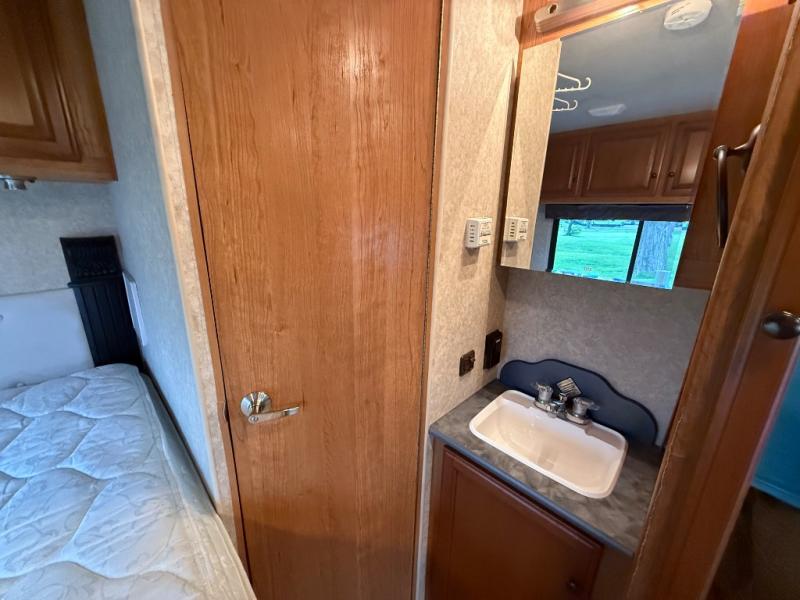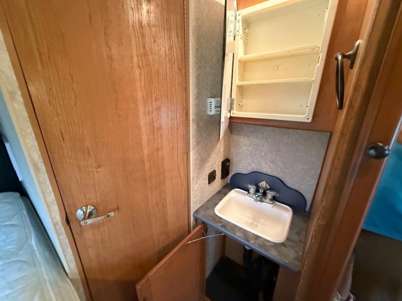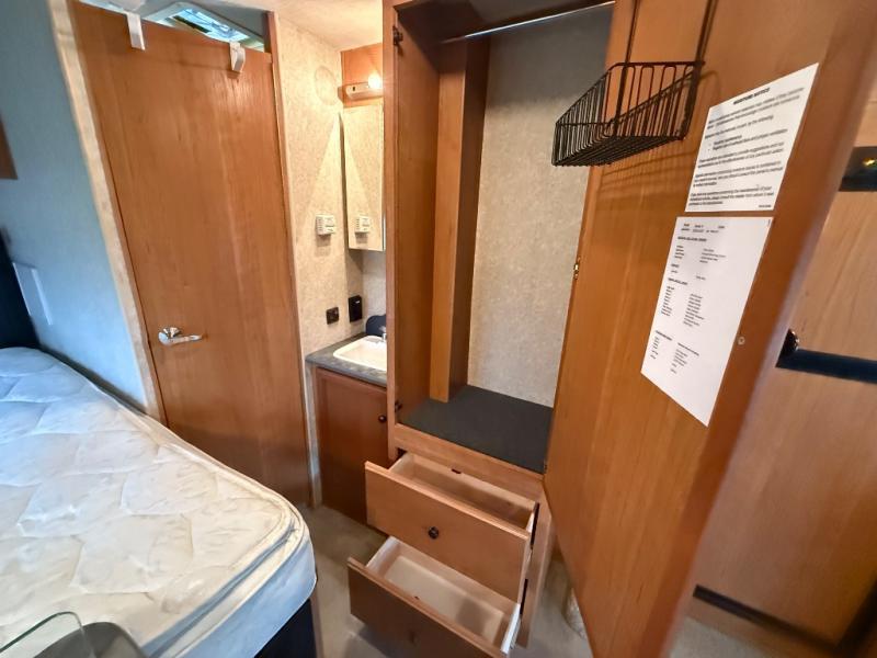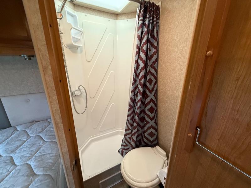 In the back of the motor home, you will find a queen bed. The bathroom has a shower and toilet. There is a sink and wardrobe just outside of the bathroom.