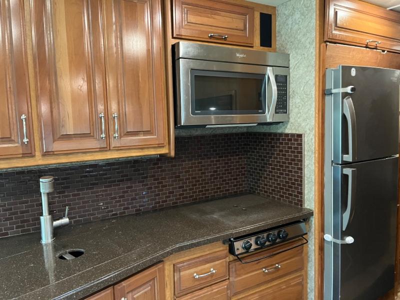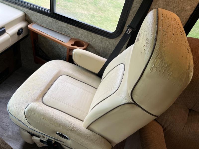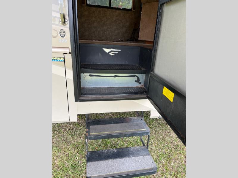 The 32VS Southwind motor home by Fleetwood is not lacking for space. Inside this model you will find an Euro chair with ottoman and an end table on the right when you step inside. On the other side of the chair is a double kitchen sink, three burner range, microwave, and refrigerator. The opposite side of the motor home has a sofa sleeper and dinette slide.