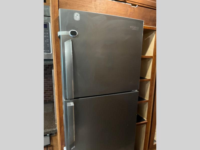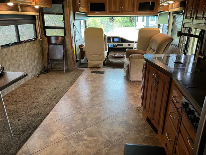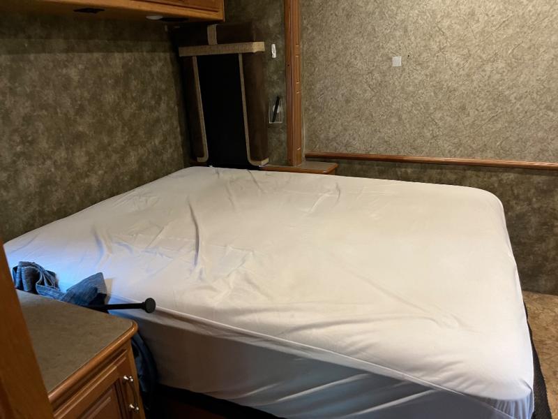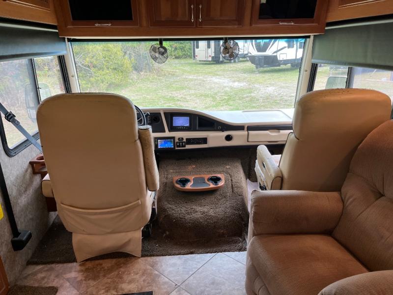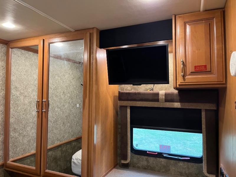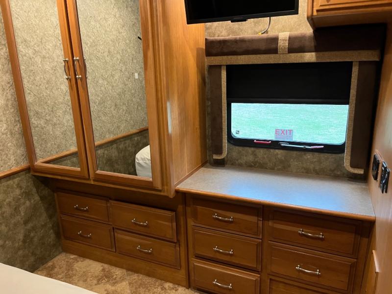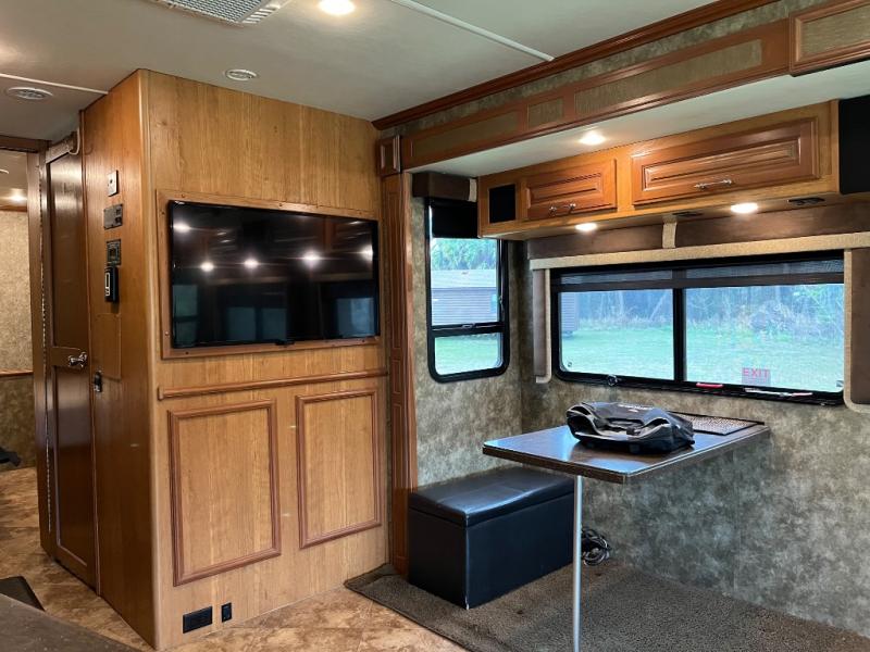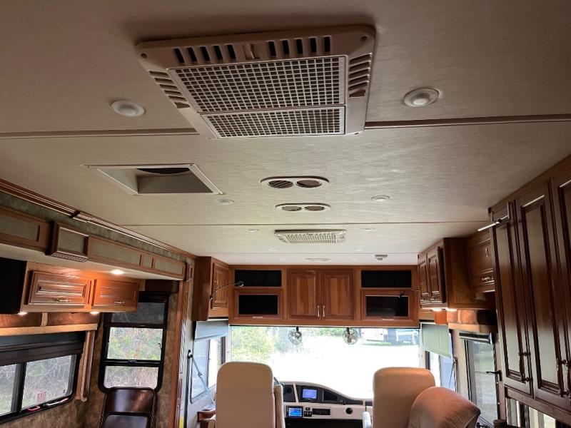 This motor home has plenty of overhead cabinet space for storage. There are also plenty of options to help tailor this motor home for your needs. You can choose a front 32" LED TV, 3 burner range with oven, sofa sleeper with air mattress & footrest, mid-ship 40" LED TV, free standing recliner, facing dinette, free-standing dinette with credenza, and a queen bed with air mattress.