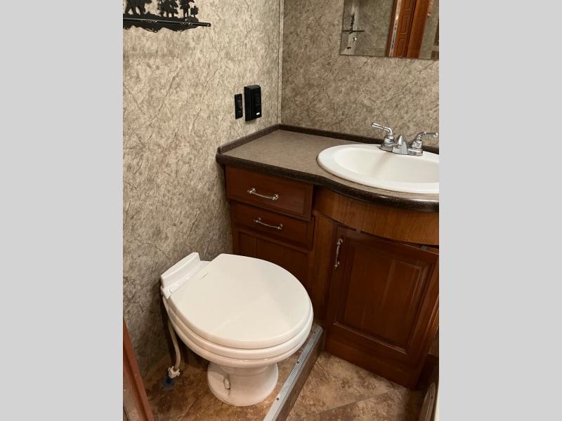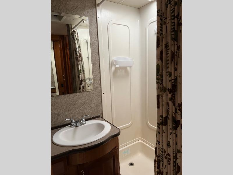 As you proceed down the hallway toward the rear of the motor home, the side aisle bathroom is on the right. Inside the bathroom you will find a shower, sink, and toilet.