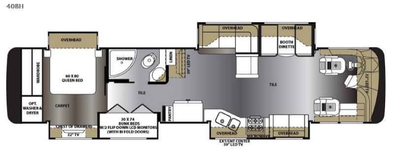 Along one side of the motor home there is a slide with a sofa, three burner range, and double kitchen sink. Next to the slide you will find a refrigerator and pantry. On the opposite side of the motor home here is another slide with a booth dinette and a l-shaped sofa. Adjacent to the sofa you will find a 39" LED TV.