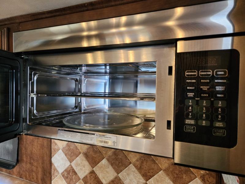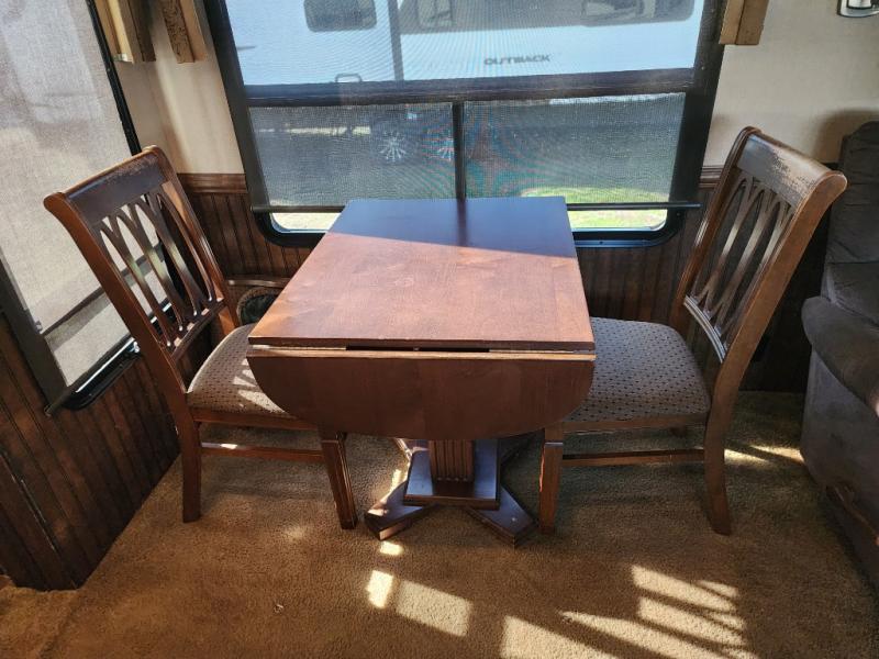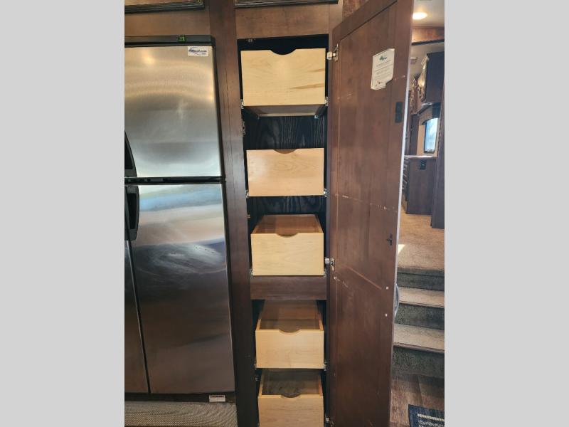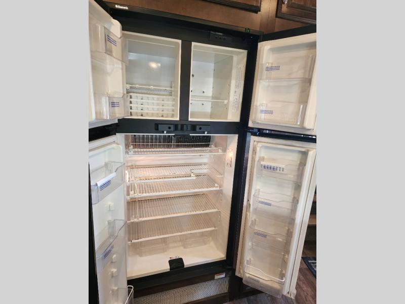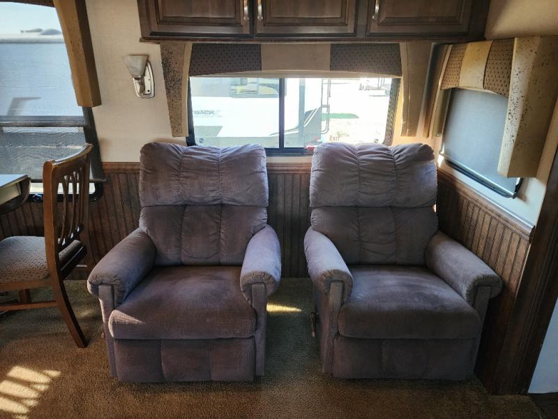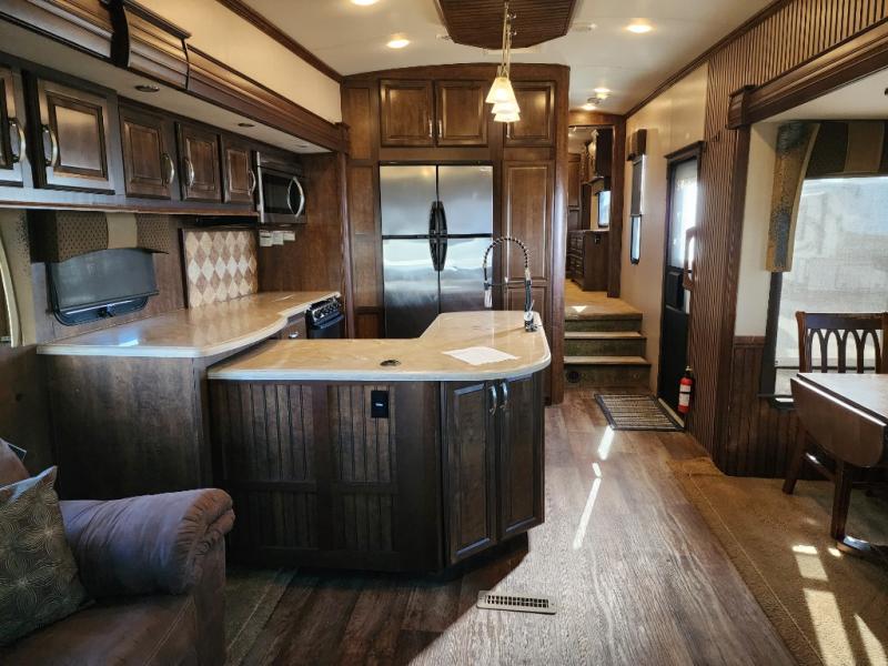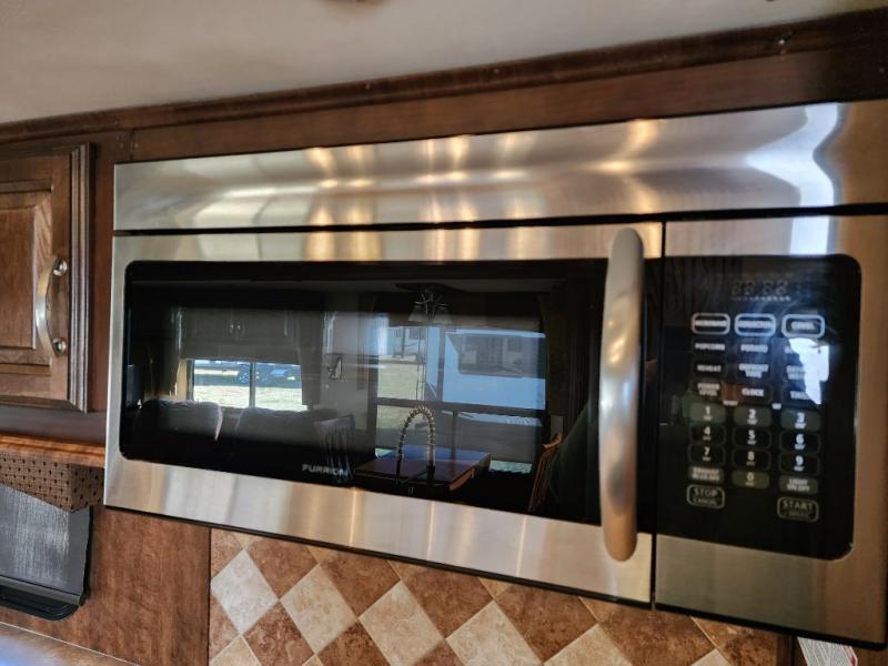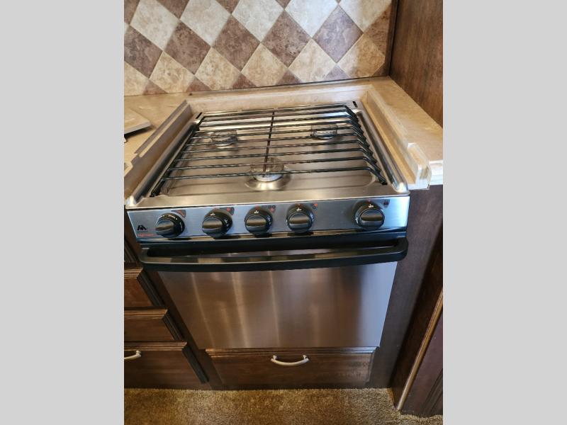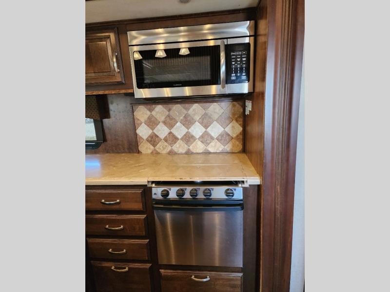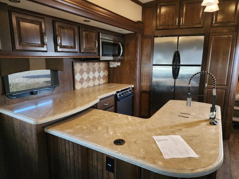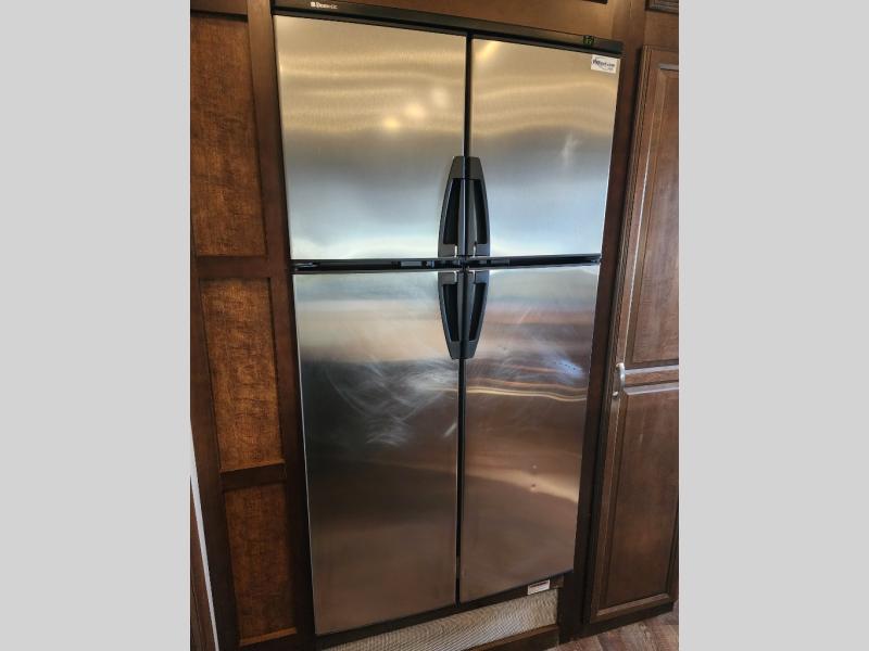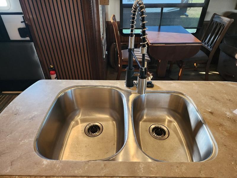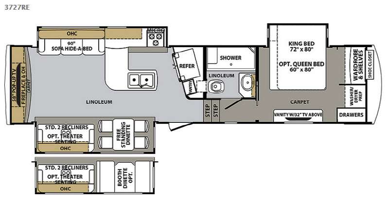 As you enter the 3727RE there is a slide to the left. The slide has a free standing dinette and two recliners or you can choose optional theater seating. Along the rear wall there is a 58" LED TV with fireplace below. The other slide has a 90" sofa hide-a-bed, microwave, and three burner range. There is plenty of counter space with the l-shaped counter. You will also find a double kitchen sink, refrigerator, and pantry.