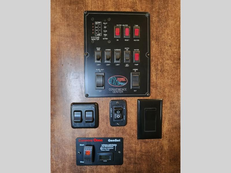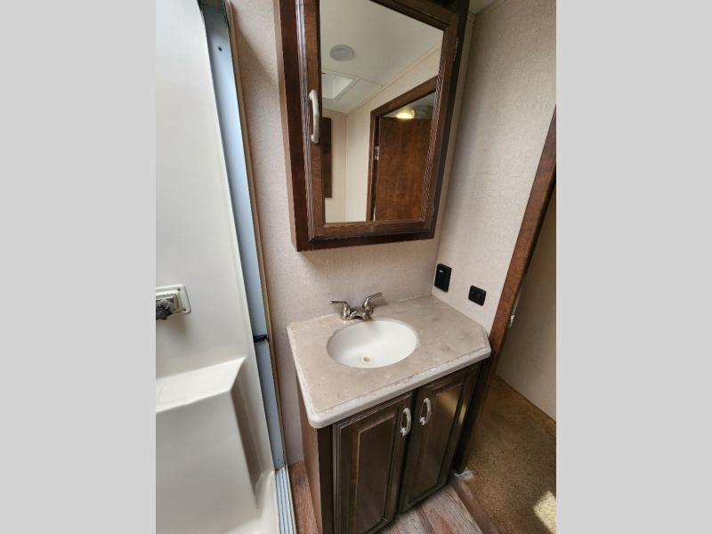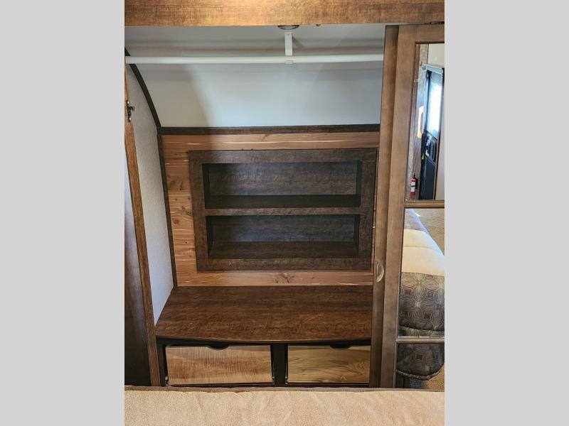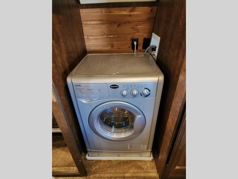 The bedroom has a king bed slide or you can choose an optional queen bed, wardrobe & shelves, drawers, and vanity with a 32" TV above the vanity. You will also notice that the bedroom is prepped for a washer and dryer.