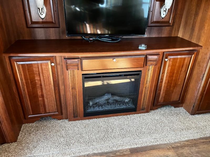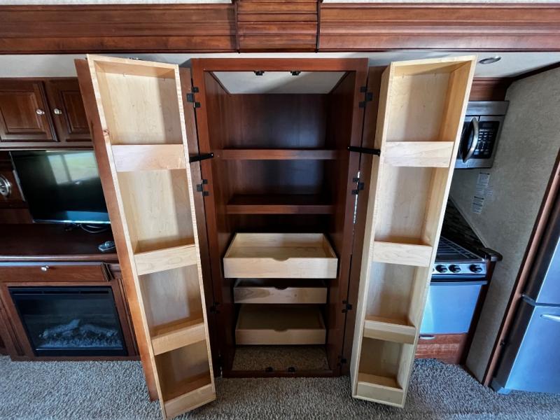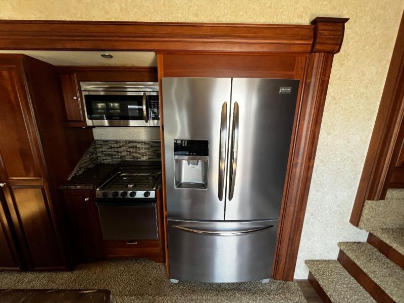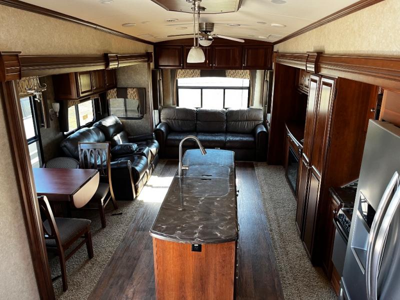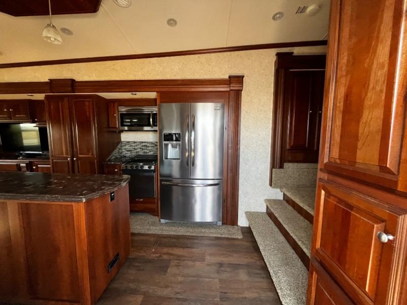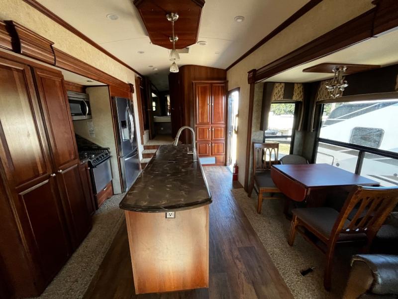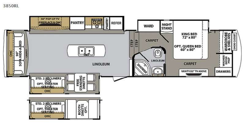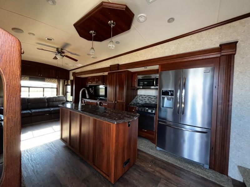 As you enter the fifth wheel, to the left is a slide with a free-standing dinette, and two recliners or you can choose optional theater seats. Along the rear wall there is a sofa hide-a-bed. The other slide has a 58" pop-up TV with a fireplace below the TV, pantry, microwave, three burner range, additional pantry, and a refrigerator. There is also a kitchen island with a double kitchen sink.