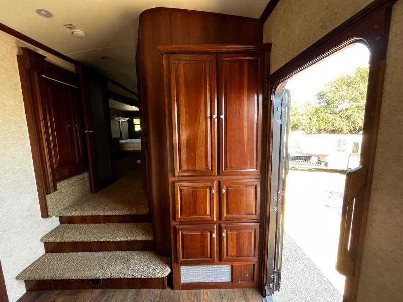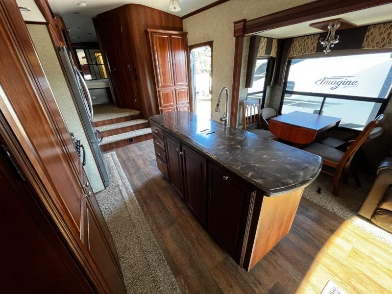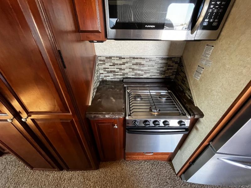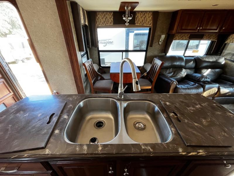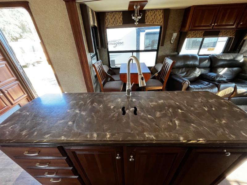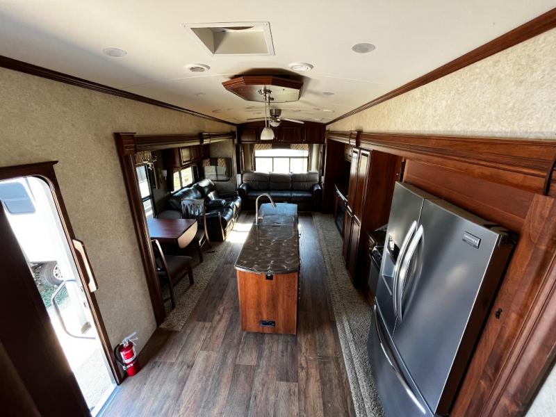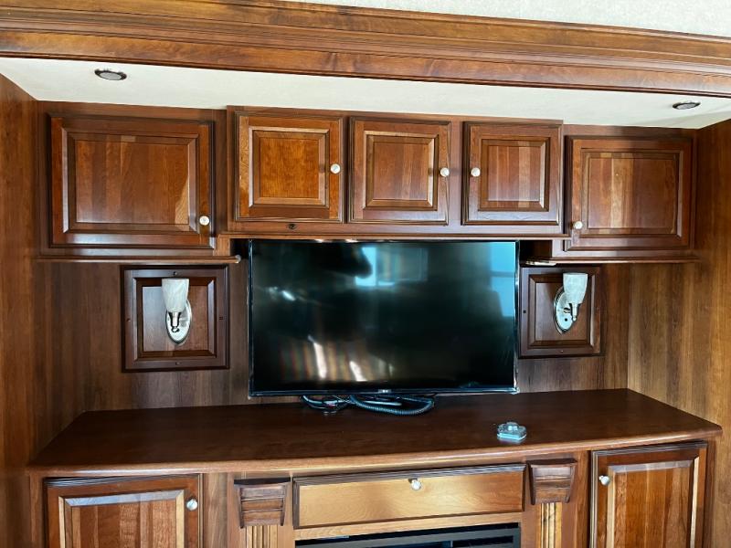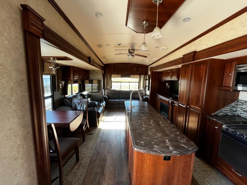 As you enter the fifth wheel, to the left is a slide with a free-standing dinette, and two recliners or you can choose optional theater seats. Along the rear wall there is a sofa hide-a-bed. The other slide has a 58" pop-up TV with a fireplace below the TV, pantry, microwave, three burner range, additional pantry, and a refrigerator. There is also a kitchen island with a double kitchen sink.