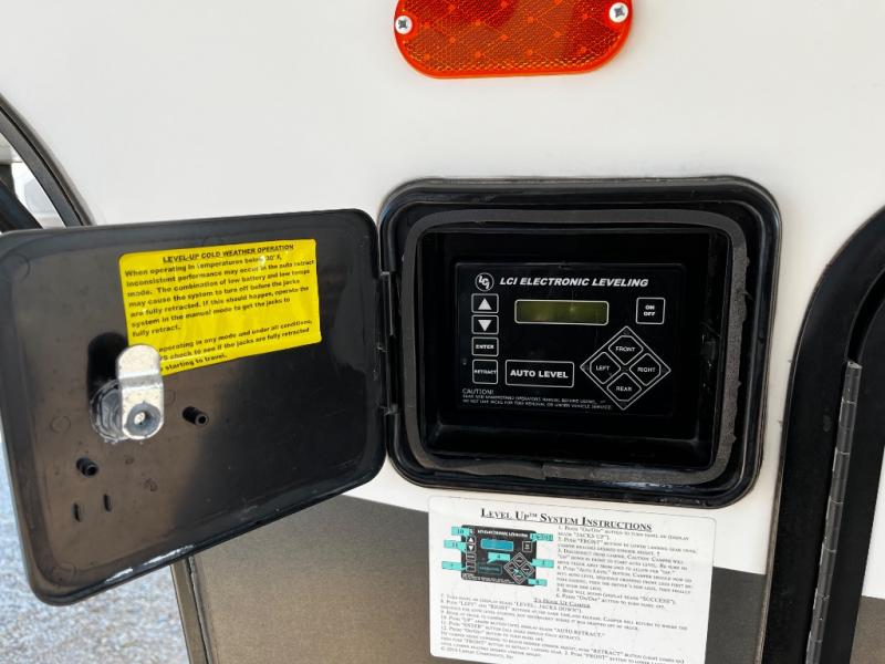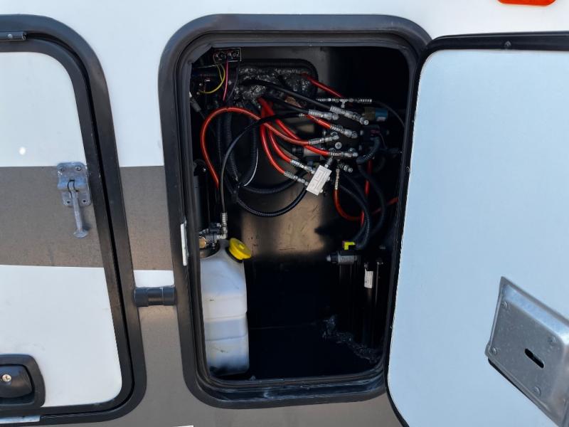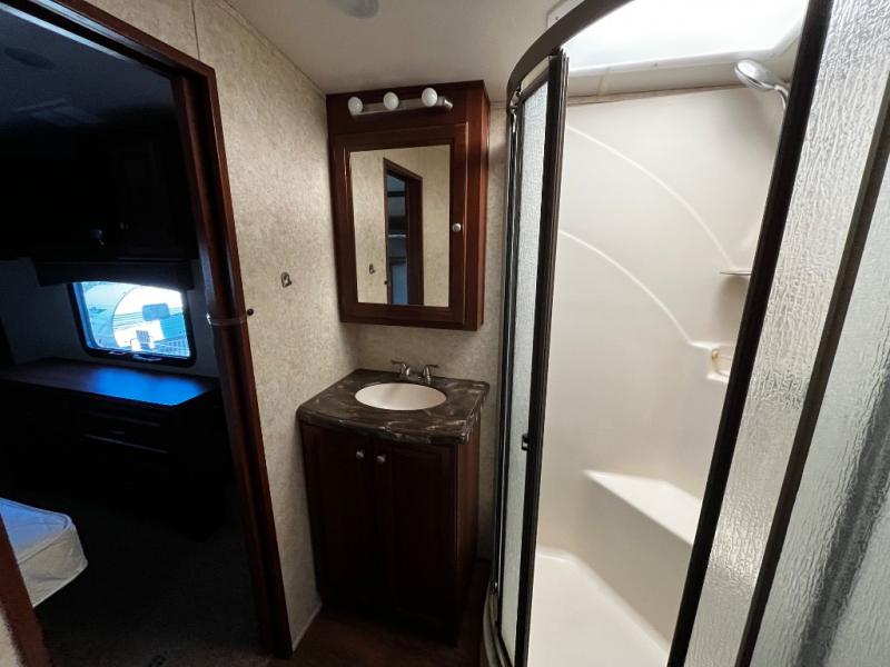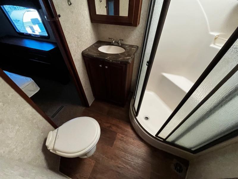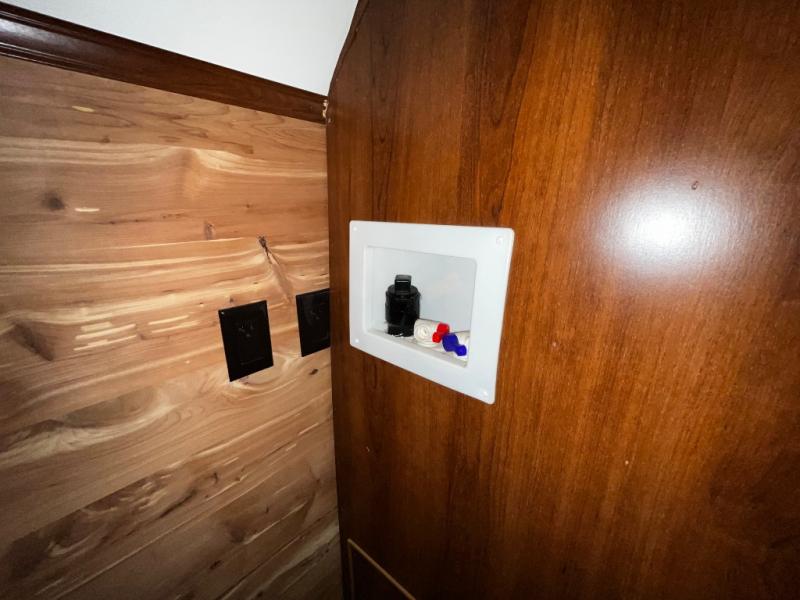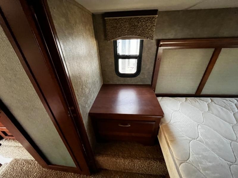 The bedroom has a slide with a wardrobe, nightstand, and king bed or you can choose an optional queen bed. There is also a wardrobe with shelves, washer/dryer prep, drawers, and a vanity with a 32" TV above the vanity.