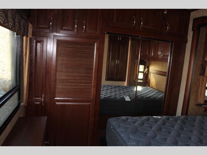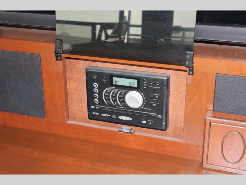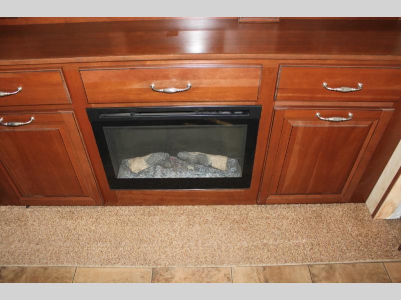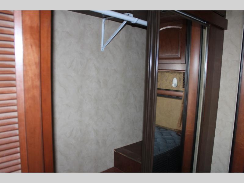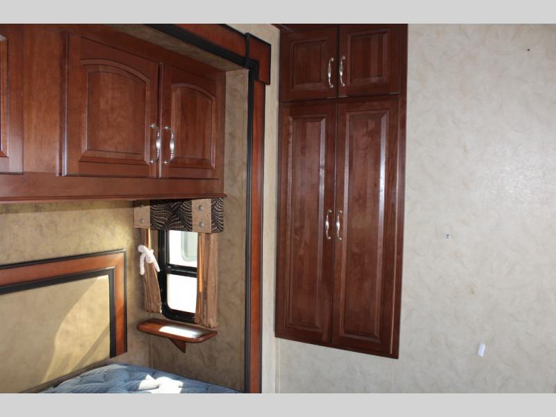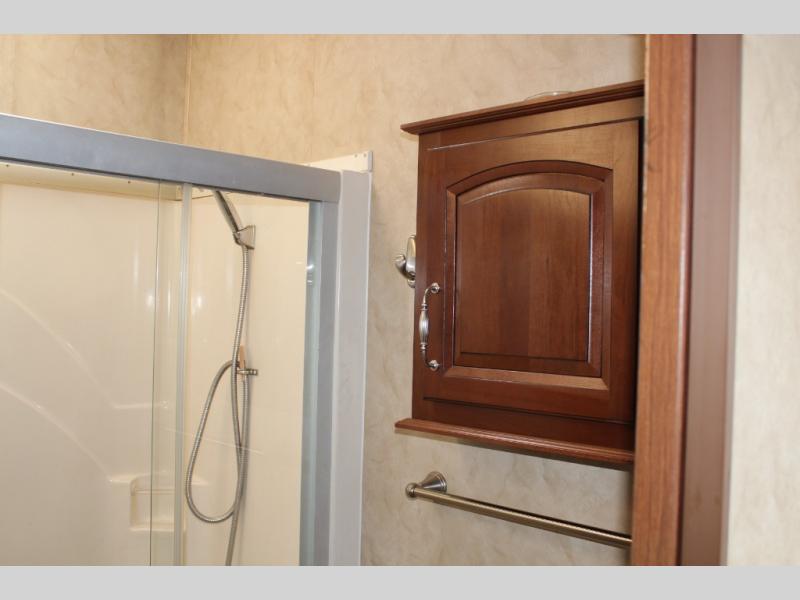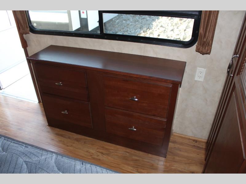 The rear bedroom offers a queen bed slide, a wardrobe, washer and dryer prepped, and drawers. You will also find a dresser opposite the bed for additional storage. There is a convenient second entry door into the bedroom.