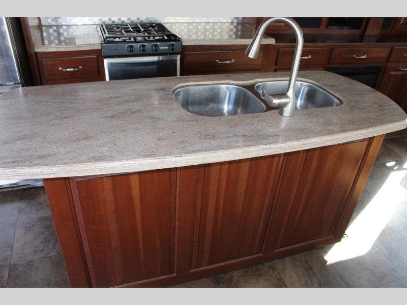 Inside the front main entrance to the right is the kitchen and living area. The kitchen and living area offer two slides which provide much space. The first slide has a free-standing table and chairs and two lounge chairs. In the front of the trailer, there is a sofa with end tables. The second slide offers a refrigerator, pantry, three burner range, microwave, pantry with dressers, and plenty of overhead space. There is also a kitchen island with a double sink.