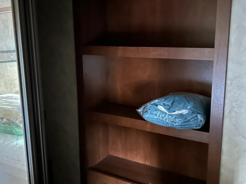 The front bedroom features a queen bed slide with shelves on either side—or opt for a king bed for even more sleeping space. A front wardrobe provides generous storage, and the dresser with a TV adds the finishing touch to your personal hideaway. -
