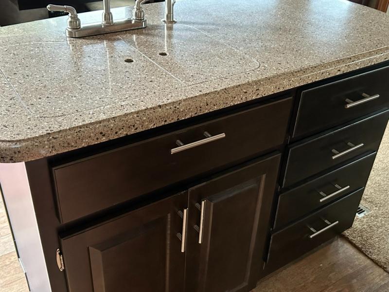 A central kitchen island with a double sink gives you extra prep space and convenience. The kitchen slide includes a three-burner range, microwave, and a roomy refrigerator. There’s ample counter space for cooking, serving, and storing your essentials. -