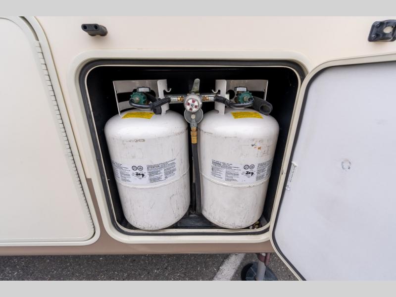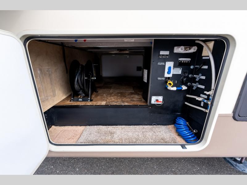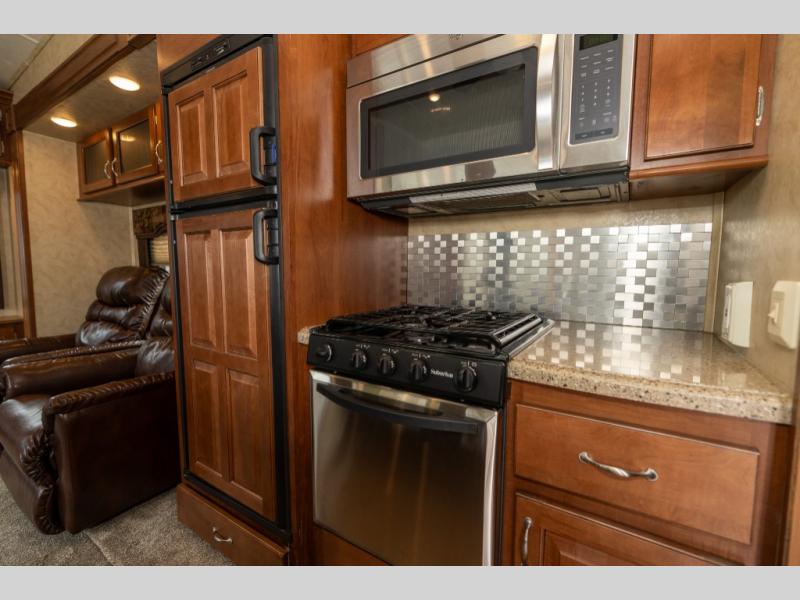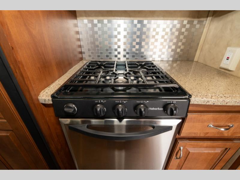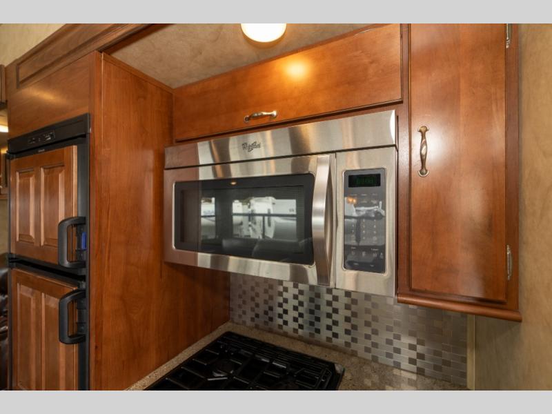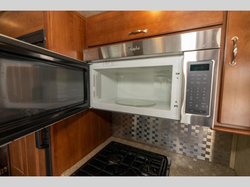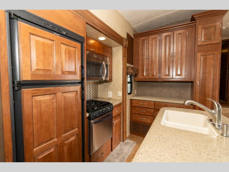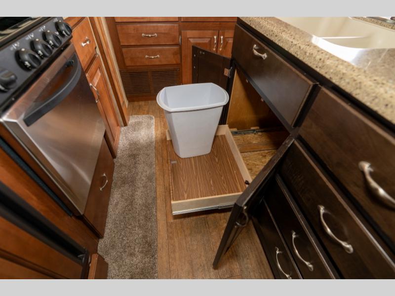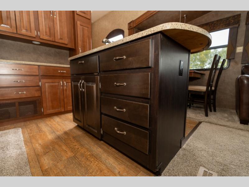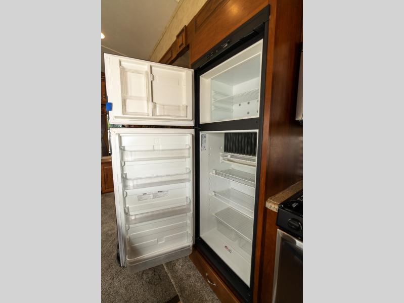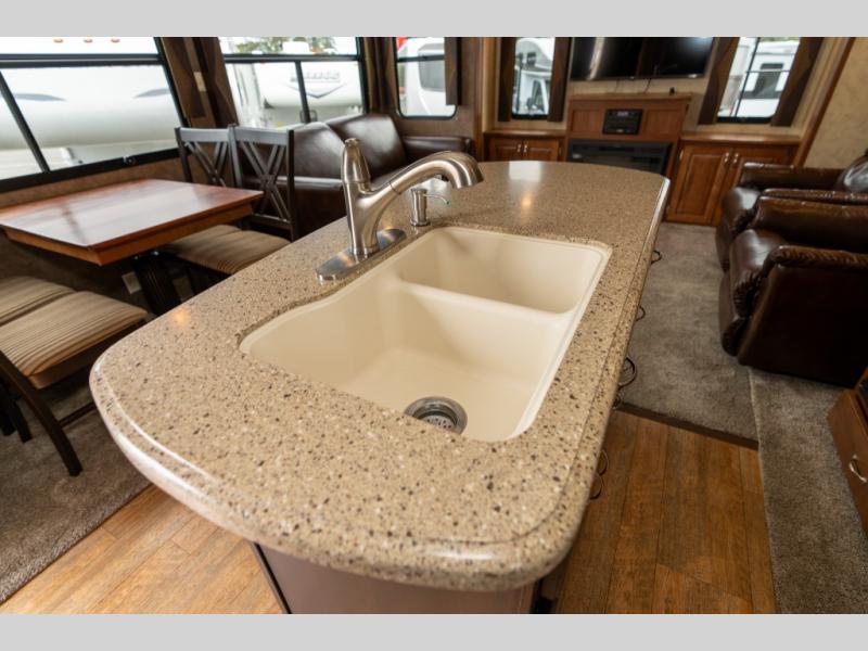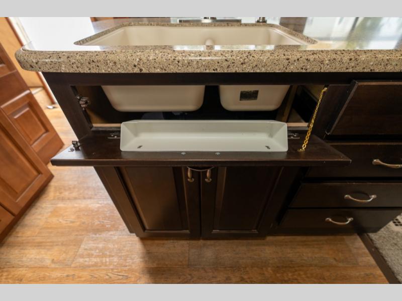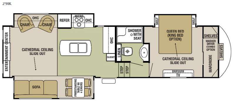 Stepping inside the 29IK, to the left is a slide with a dinette and sofa. The rear wall offers a full entertainment center for your enjoyment. There is another slide with two lounge chairs, refrigerator, microwave, and three burner range. The kitchen also has a kitchen island with a double kitchen sink, and lots of counter space.