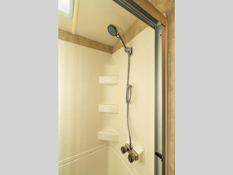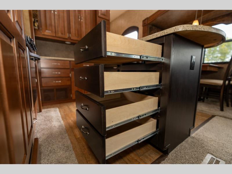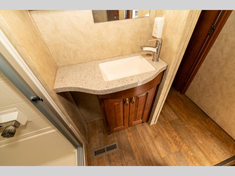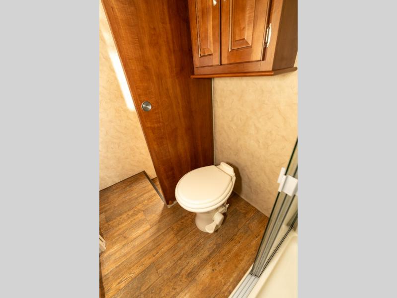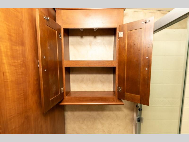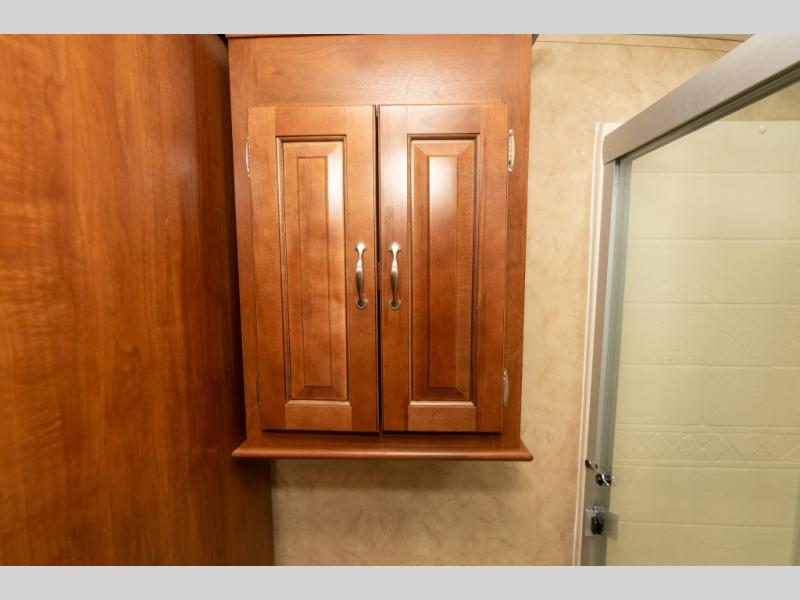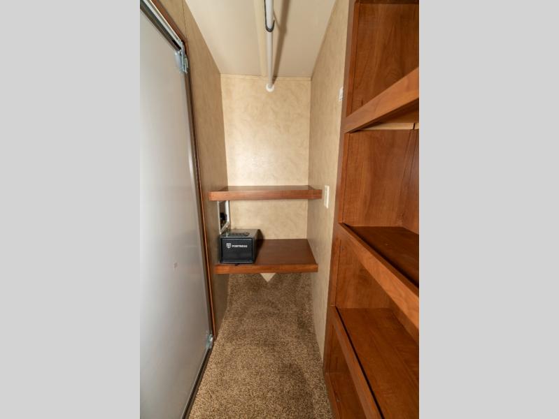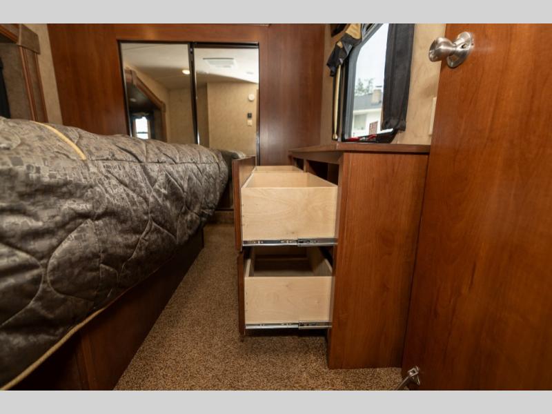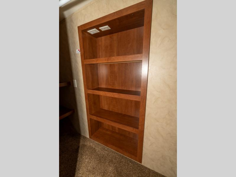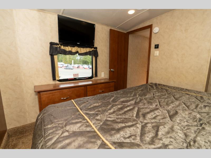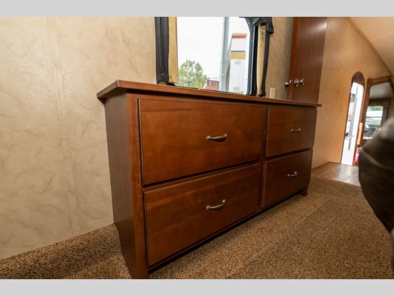 In the bedroom there is a queen bed slide with shelves on either side of the bed, or you can choose an optional king bed. There is much storage with the front wardrobe. Across from the bed you will find a dresser and a TV above the dresser. Also in the wardrobe there is an optional washer/dryer combo.