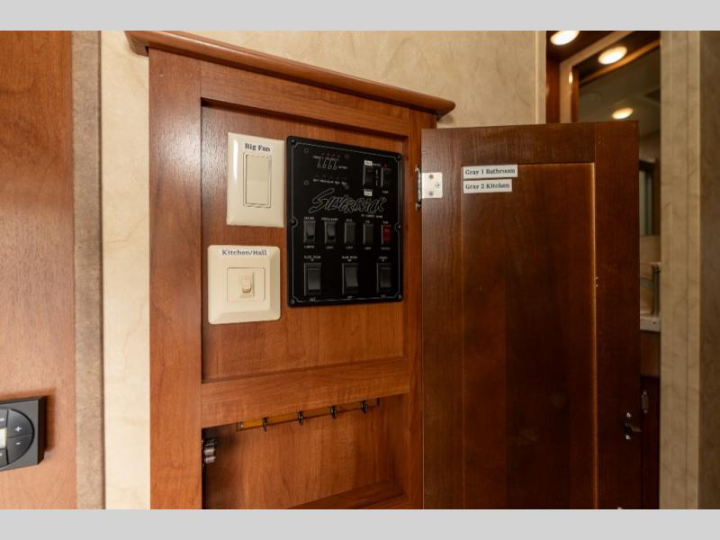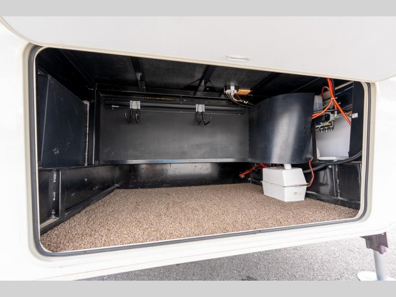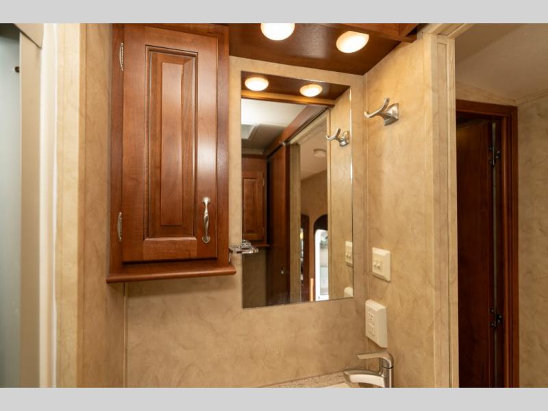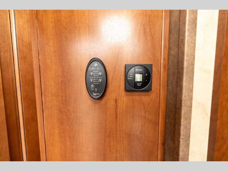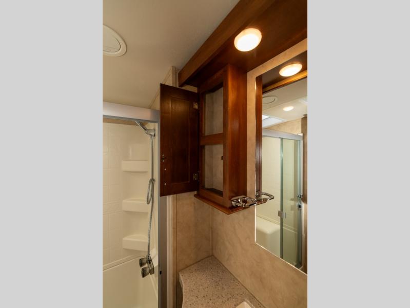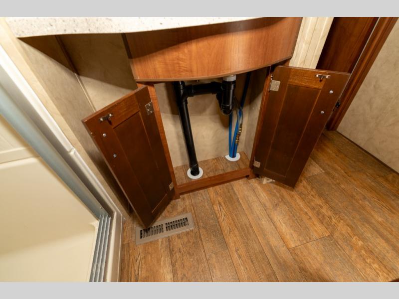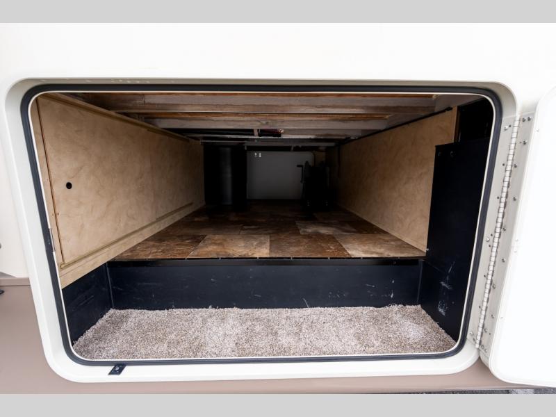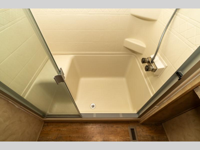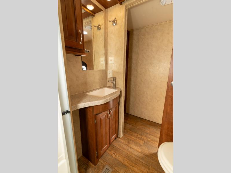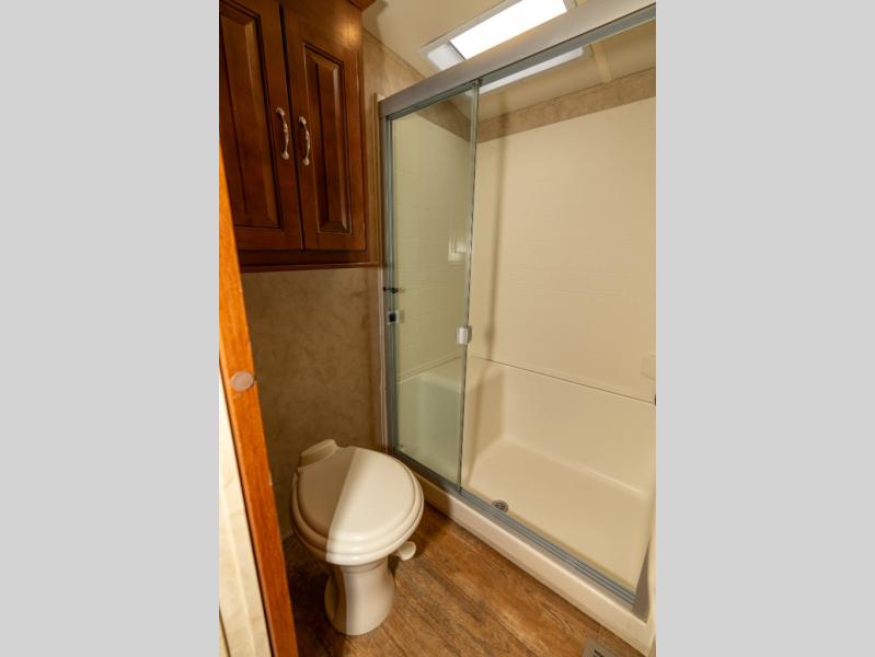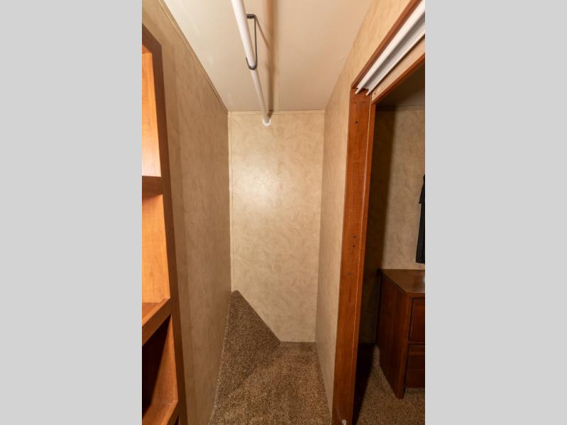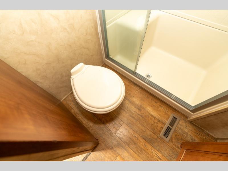 In the bedroom there is a queen bed slide with shelves on either side of the bed, or you can choose an optional king bed. There is much storage with the front wardrobe. Across from the bed you will find a dresser and a TV above the dresser. Also in the wardrobe there is an optional washer/dryer combo.