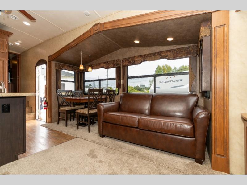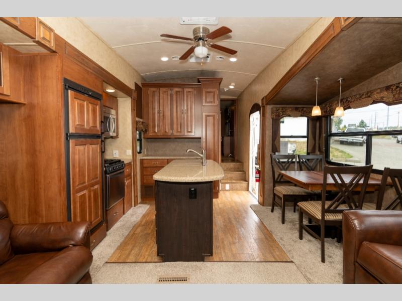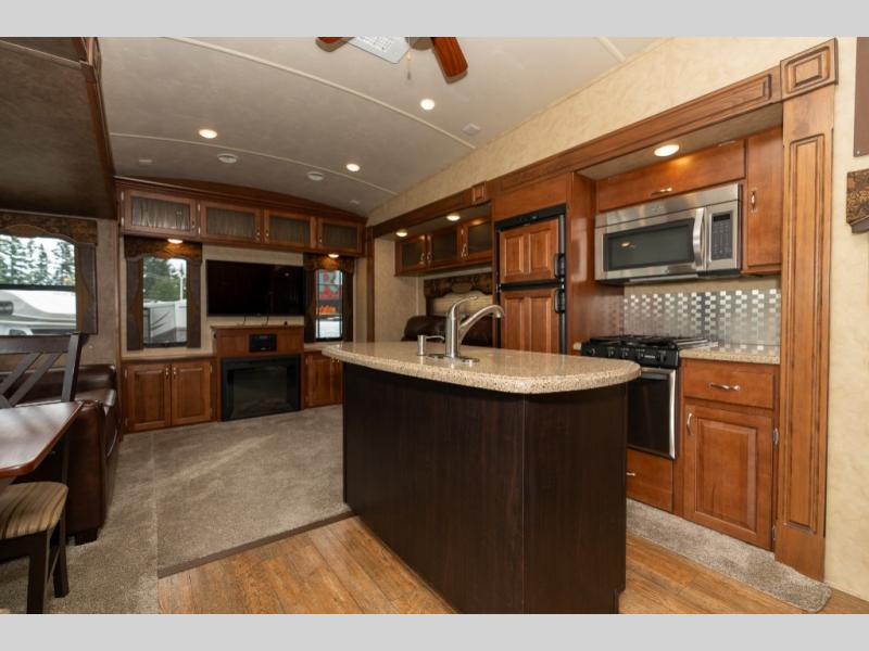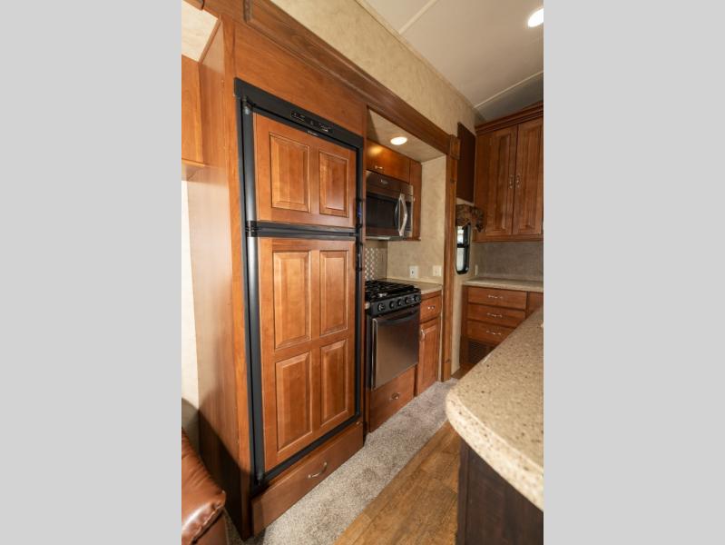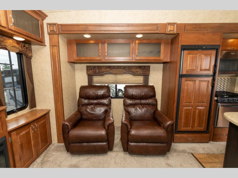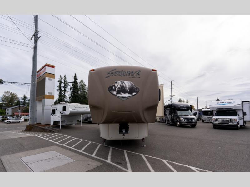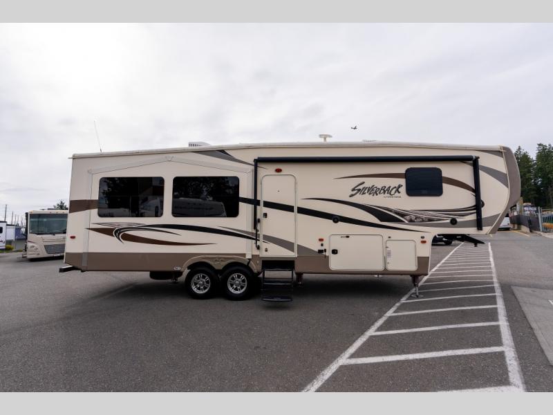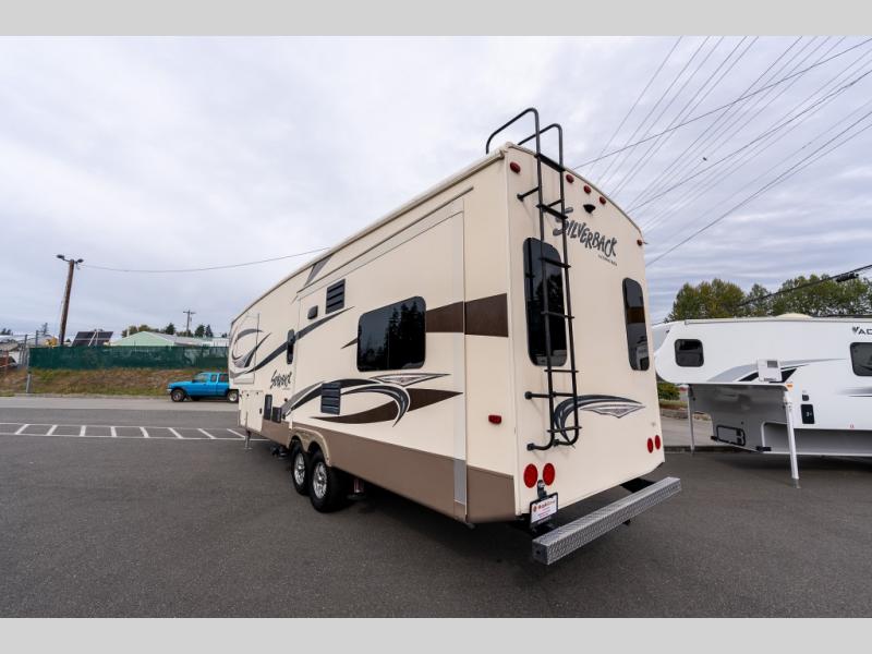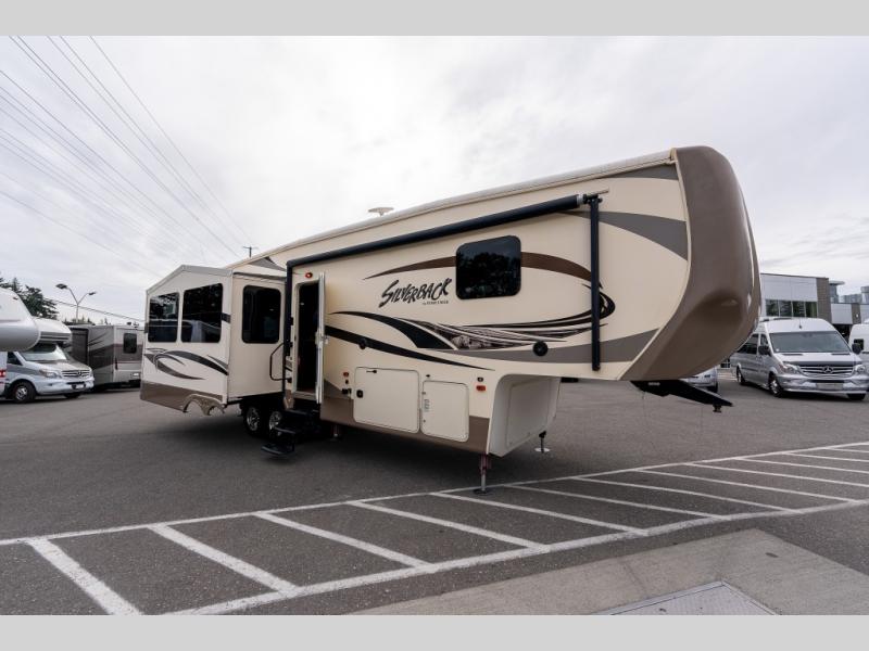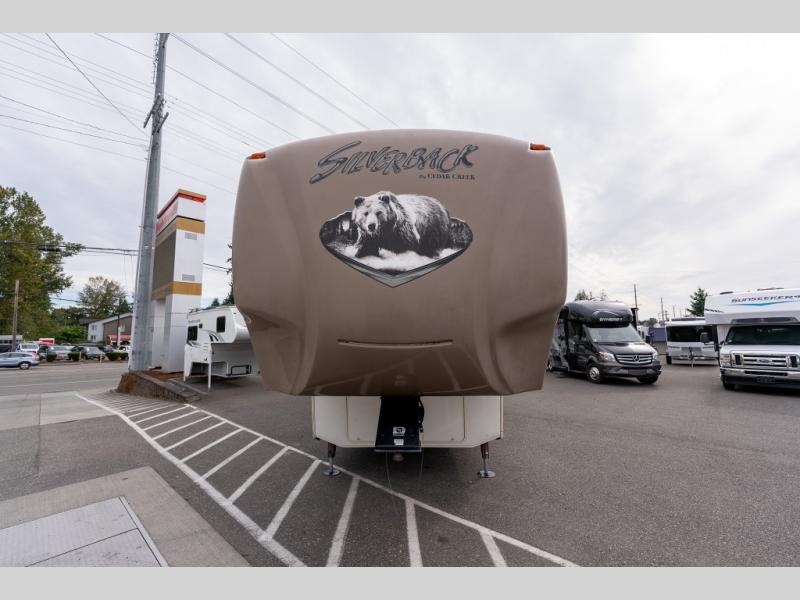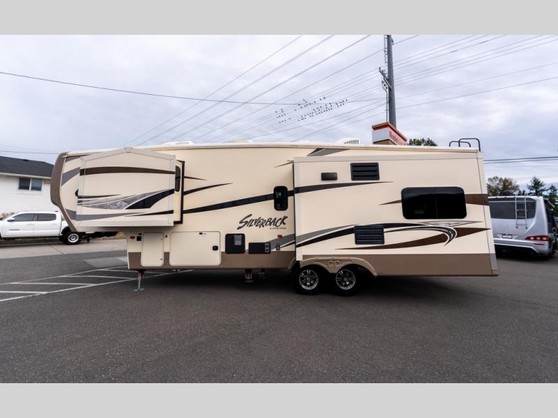 The Cedar Creek Silverback 29IK fifth wheel by Forest River offers triple slides and a rear entertainment center.