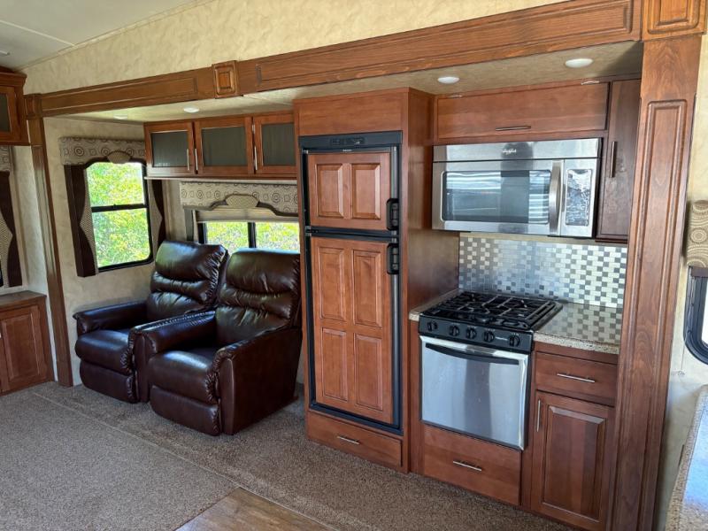 As you enter the fifth wheel, to the left is a slide with a dinette and sofa. The rear wall has an entertainment center. There is an additional slide with two lounge chairs, refrigerator, three burner range, and microwave. You will also find the double kitchen sink along one wall with counter space surrounding the sink.