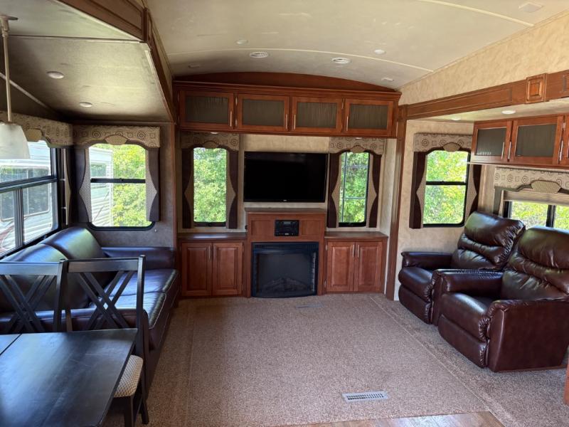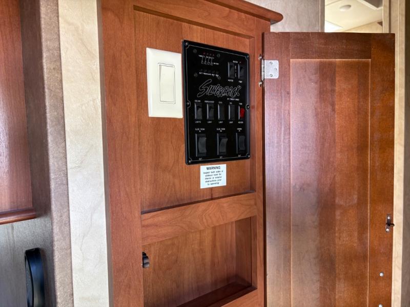 The Cedar Creek Silverback 29RE fifth wheel by Forest River features a full wall rear entertainment center, and three slides.