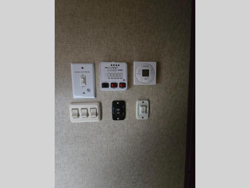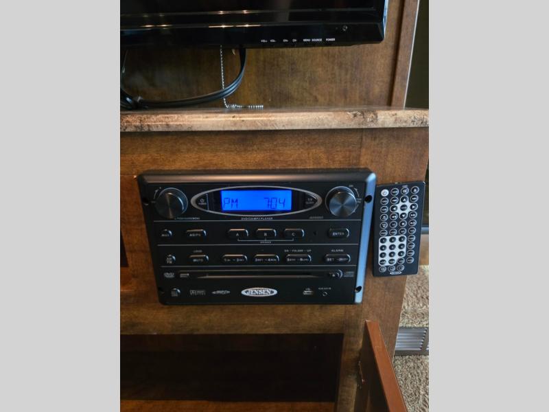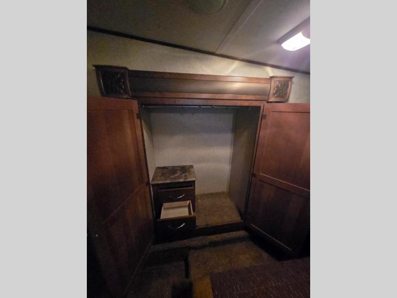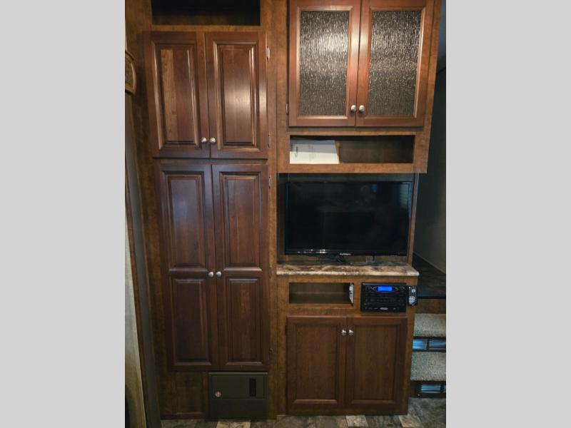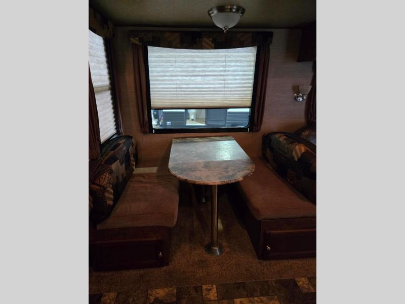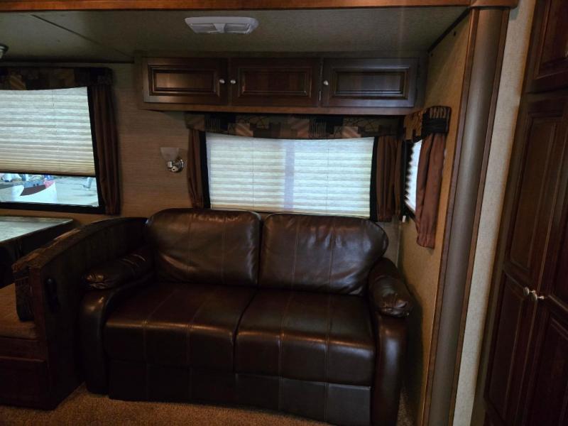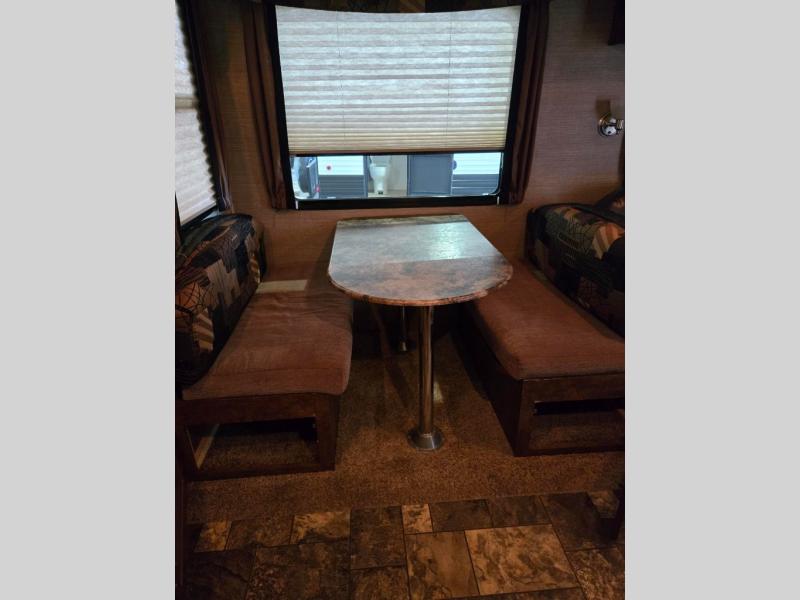 Enter and find yourself in the living room area with two swivel rockers immediately to your left with overhead cabinets above for storage. There is an entertainment center and wardrobe straight ahead along the interior living room wall also. A slide-out sofa and booth dinette opposite the door creates a more open walkway throughout the space. There are overhead cabinets above the sofa for added use.