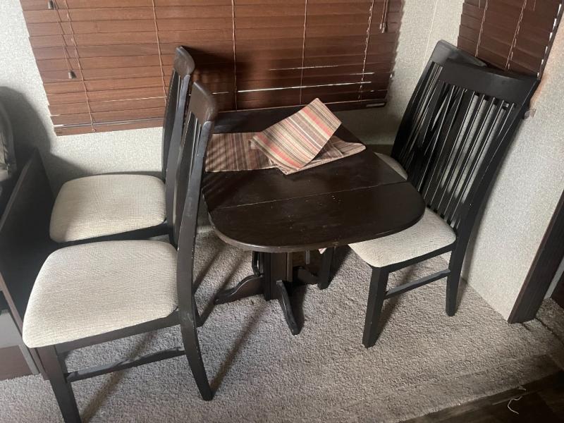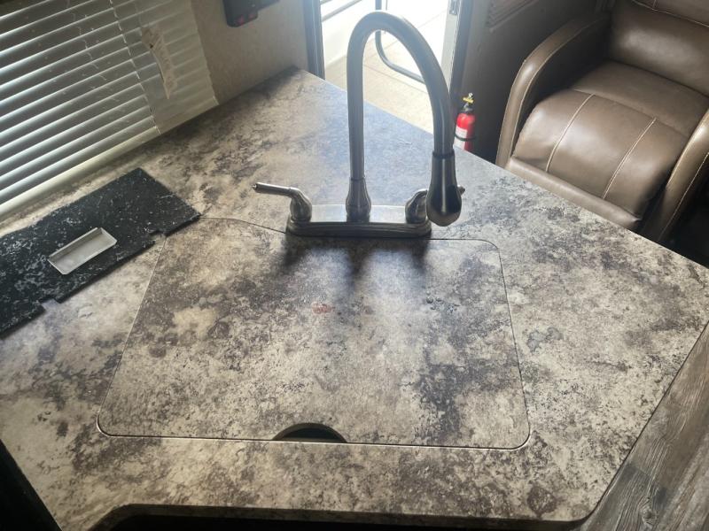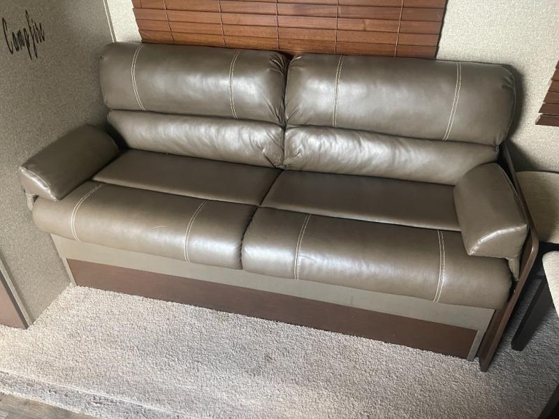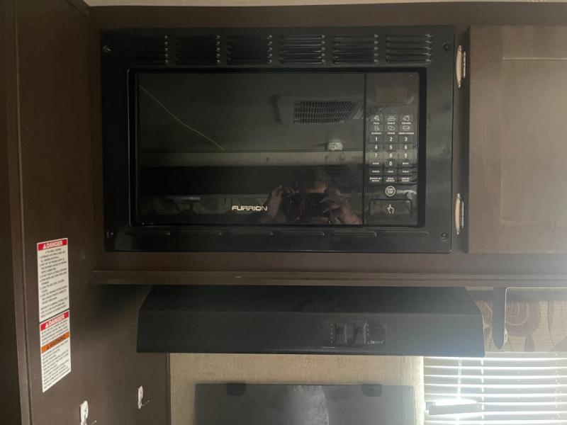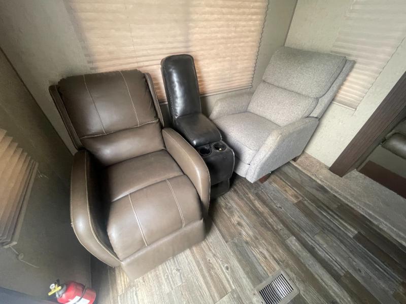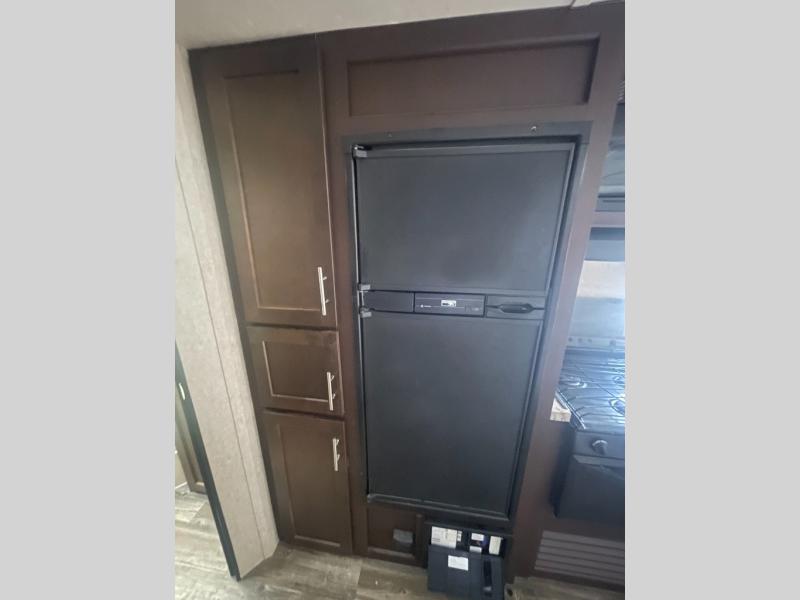 As you enter the rear entrance, along the rear wall there are two lounge chairs and a flip-up end table. The slide offers a sofa and a dinette and an optional skylight above the dinette. Next to the slide there is a nice size entertainment center. The opposite side of the trailer has a large kitchen sink, three burner range, microwave, refrigerator, and pantry.