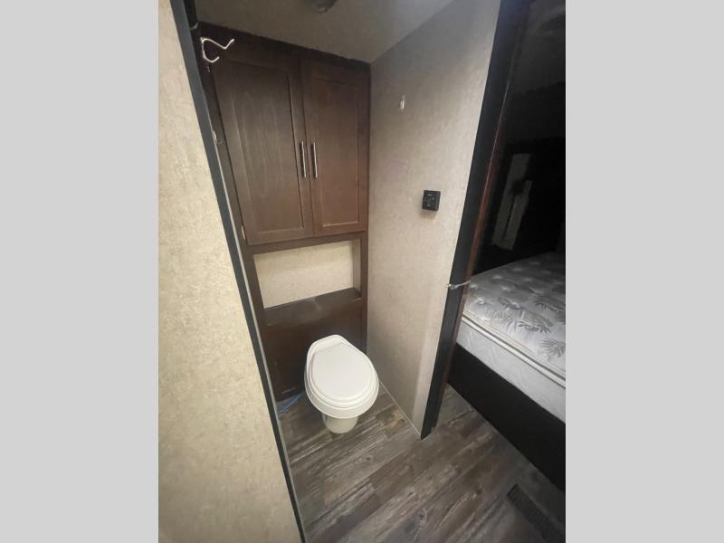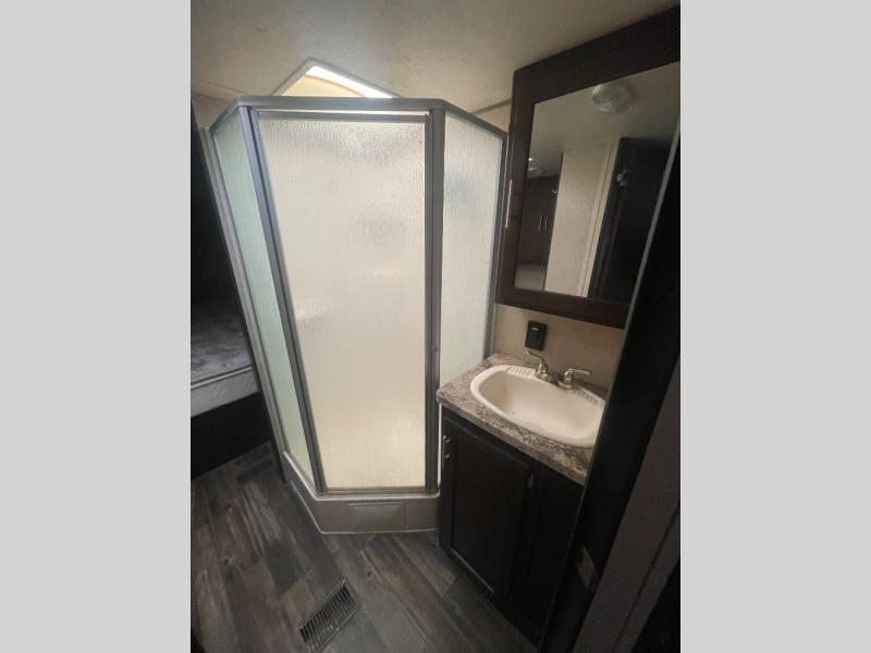 You will find that the bathroom is a walk-thru with a sink, medicine cabinet, and neo-angle shower on one side of the trailer and a toilet and wardrobe on the other side.
